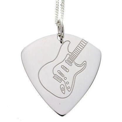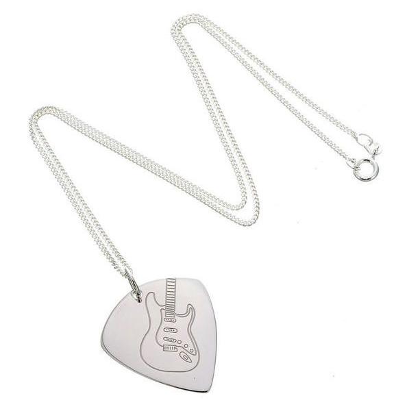 Plektrum-Anhänger mit Kette Design: S-Style-Gitarre Anhänger beidseitig geprägt 925 Silber Größe: ca. 33 mm x 26 mm 1,4 mm starke Silber-Panzerkette mit 45 cm Länge Stärke des Plektrums: 1,3 mm, mit Geschenkbox