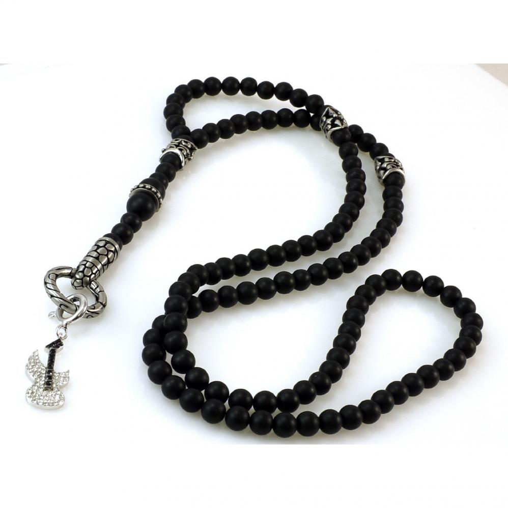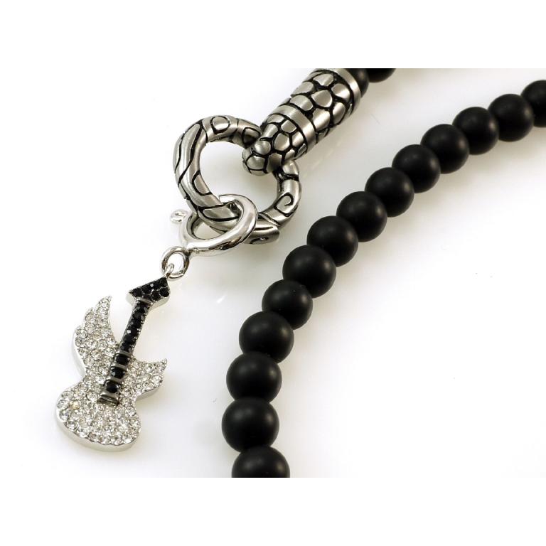 Jen Majura Design Achat Kugelkette mit Gitarren Silber Anhänger mit weissen und schwarzen Zirkonia Steinen , mit matten Achatkugeln, mit 4 Edelstahl Design Elementen und einem großen Ring der sich nach Innen öffnen läßt, Silber Anhänger Grösse 40mm Länge 10 mm Breite, alle Edelstahl Elemente mattiert, Länge der Kette 65 cm, plus Verlängerung 80 mm Länge