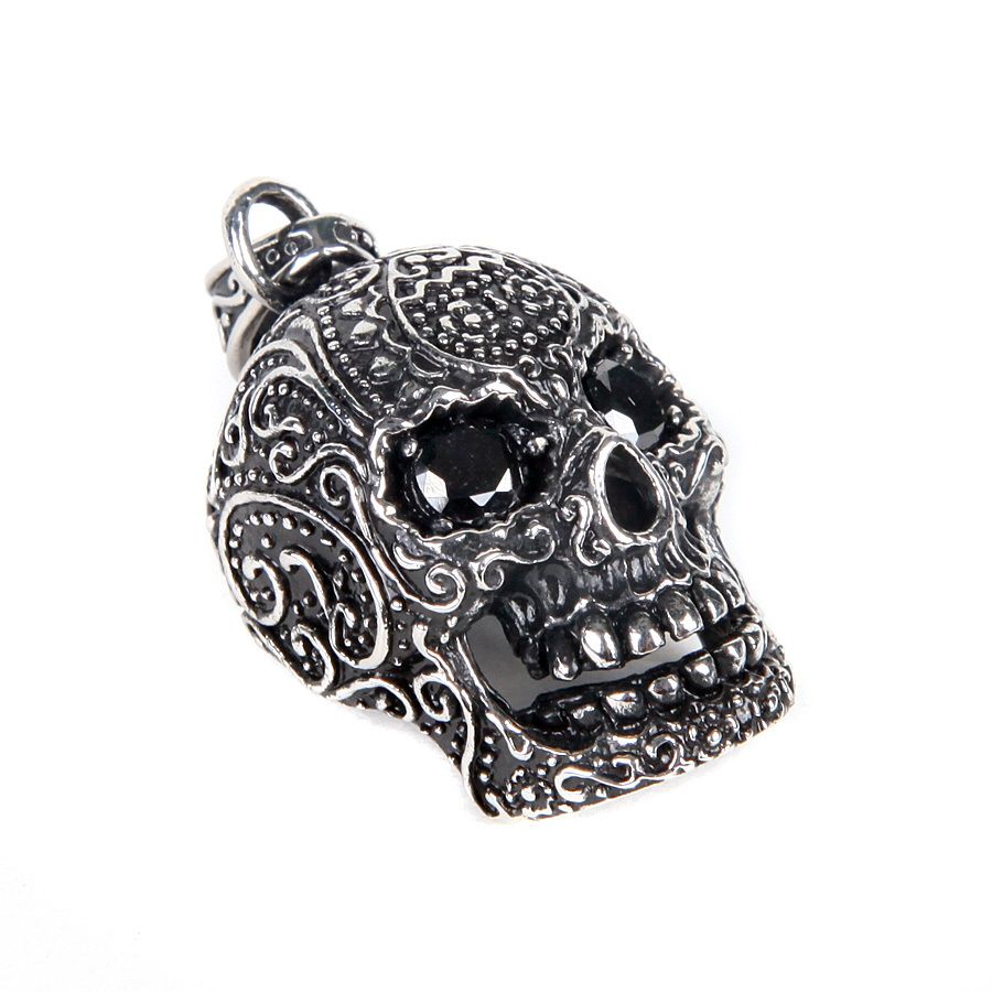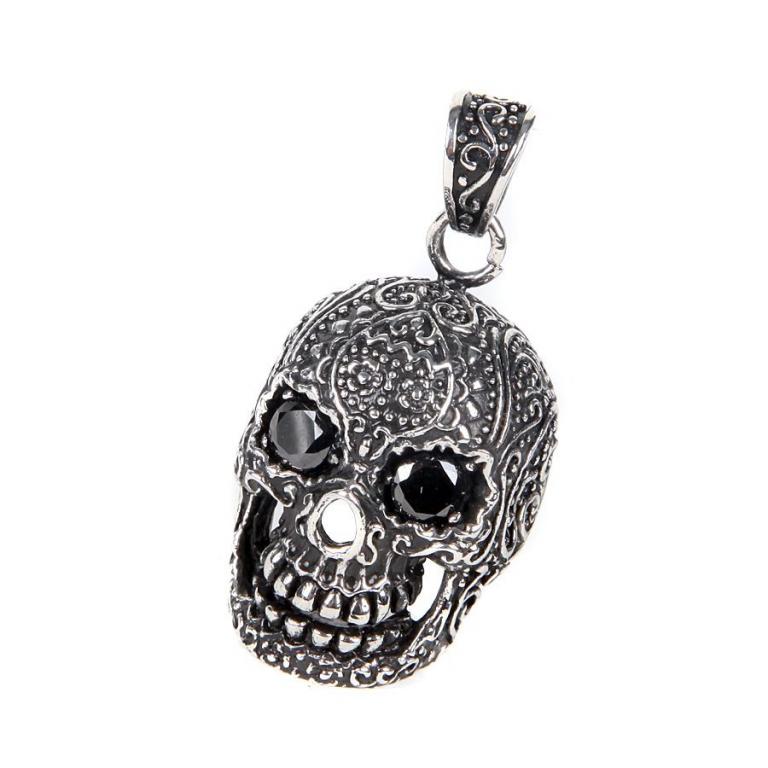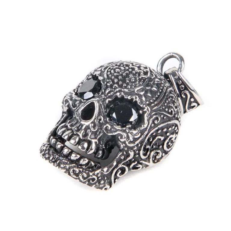 Edelstahl Anhänger Totenkopf, mit Maori Design, schwarze Zirkonia Steine in den Augen, großer Anhänger in den Maßen 50 mm x 24 mm, sehr gute Qualität