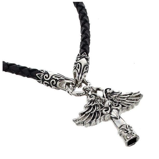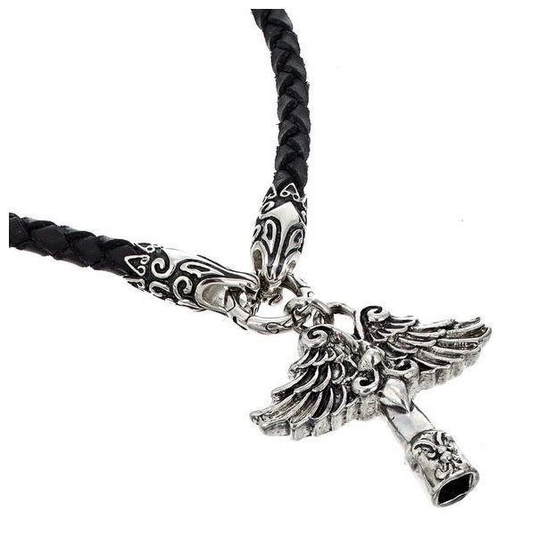 Schmuck-Stimmschlüssel Schmuck und Werkzeug zugleich Stimmschlüssel für Schlagzeug mit 70 cm langem, geflochtenen Lederband Material: 6 mm dickes, schwarzes Leder Endkappen sind Drachenköpfe aus Edelstahl mit Edelstahlring zum Einhängen des Drumschlüssels der Ring lässt sich nach innen öffnen beidseitiges Design Material: Gussmetall Größe des Anhängers: ca. 50 x 50 mm