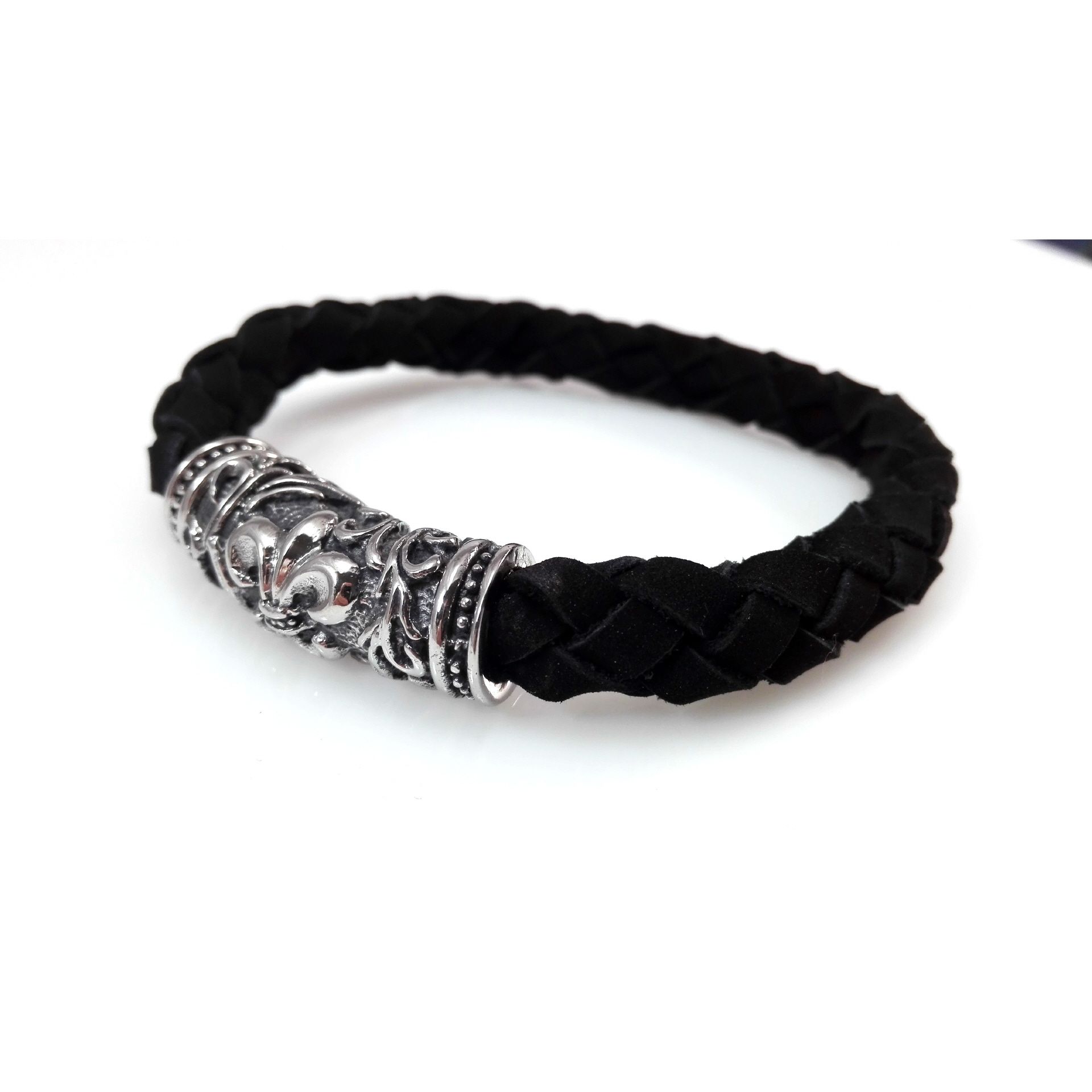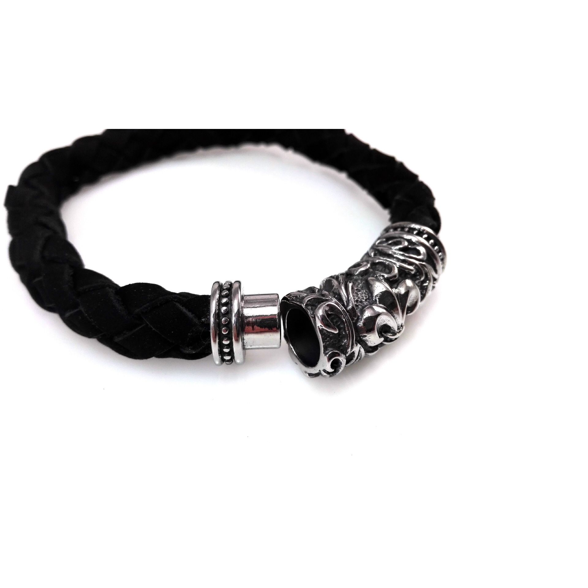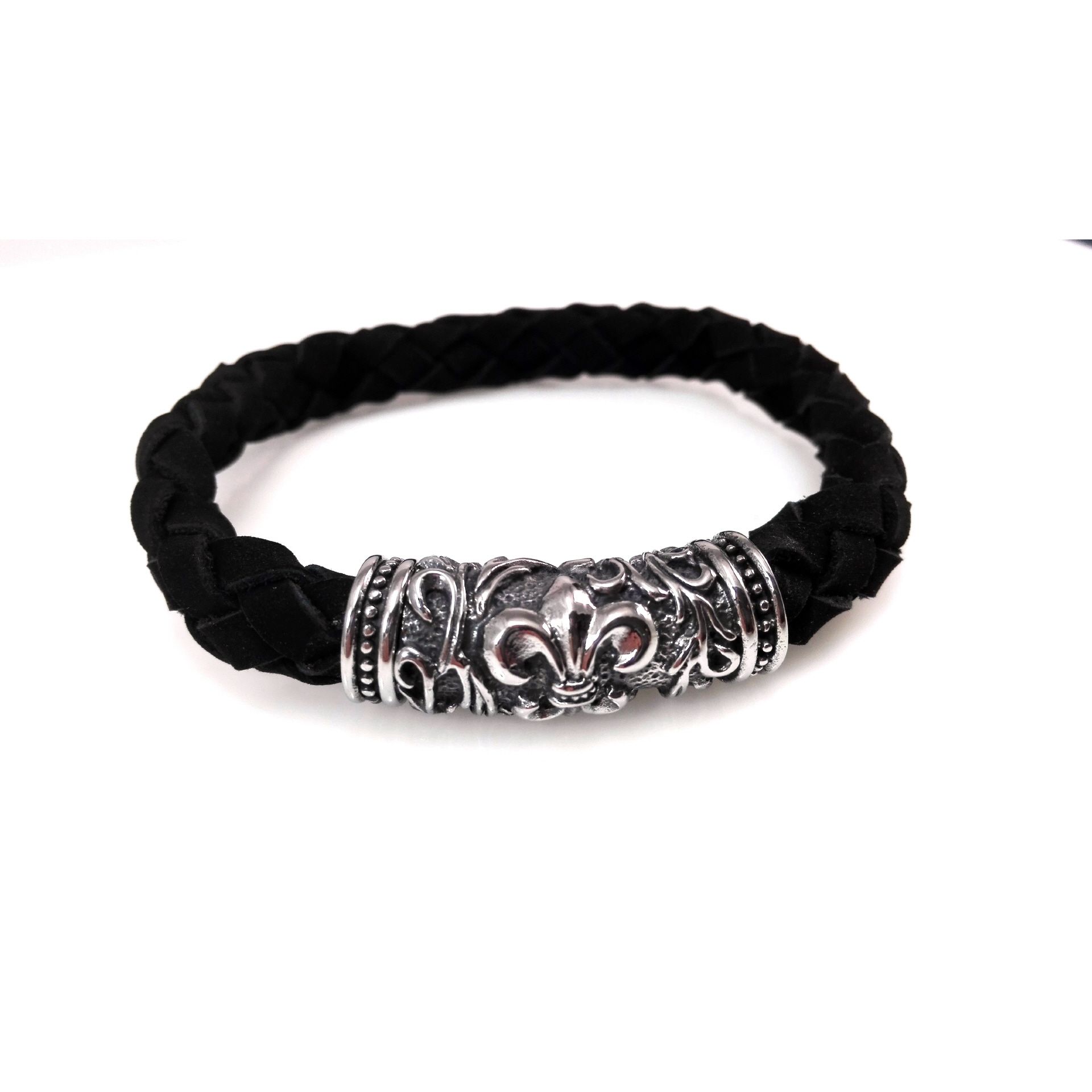 schwarzes Lederarmband aus softem Rindsleder, geflochten, mit Edelstahl Design mit Lilie, das Design ist gleichzeitig die Schließe mit Magnetverschluß, Länge 23 cm, Breite 10mm, sehr angenehm zu tragen