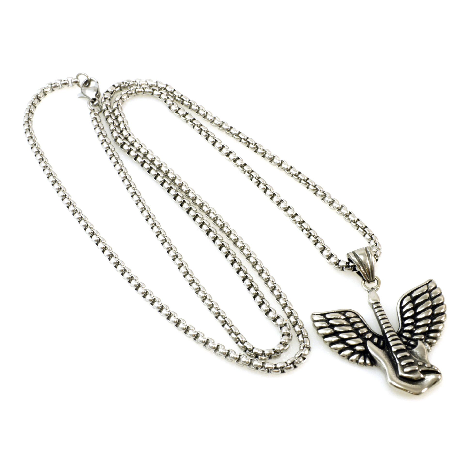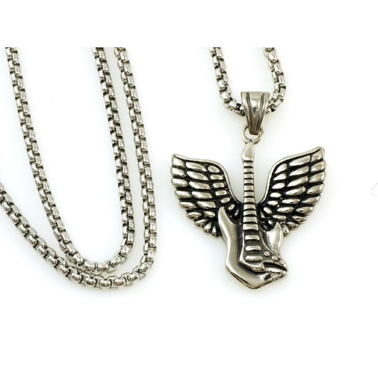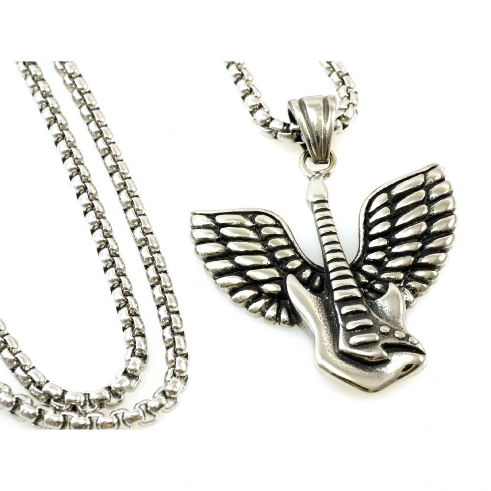 Edelstahlkette E Gitarre mit Flügeln , Anhänger Grösse 43 mm x 33 mm, Venezianer Edelstahlkette 70cm Länge , 3 mm Stärke , mit Karabiner Verschluss