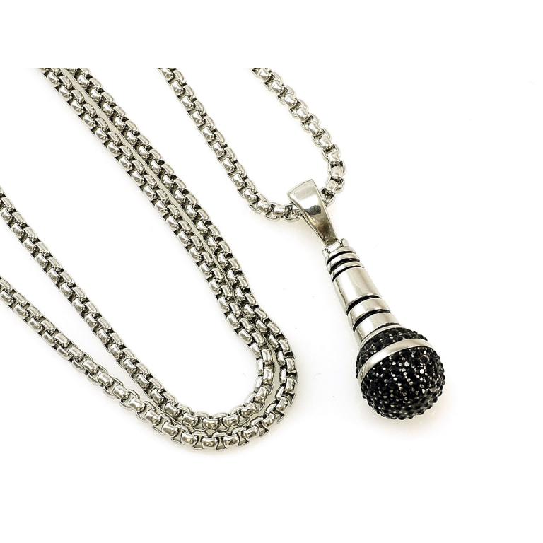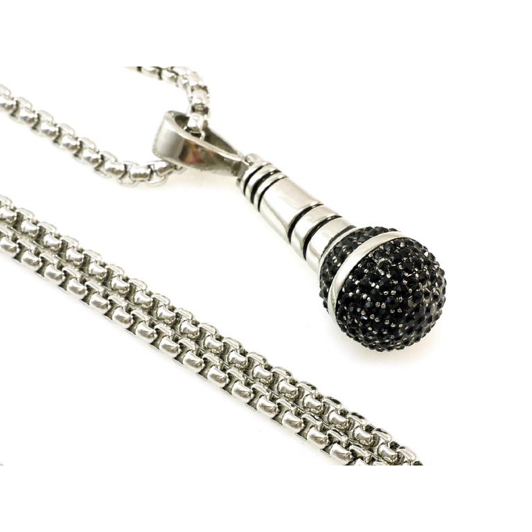 Edelstahlkette mit Mikrofon Anhänger , Anhänger mit über 100 schwarzen Zirkonia Steinen gefasst, Grösse 38 mm x 13 mm, Venezianer Edelstahlkette 70cm Länge , 3 mm Stärke , mit Karabiner Verschluss,