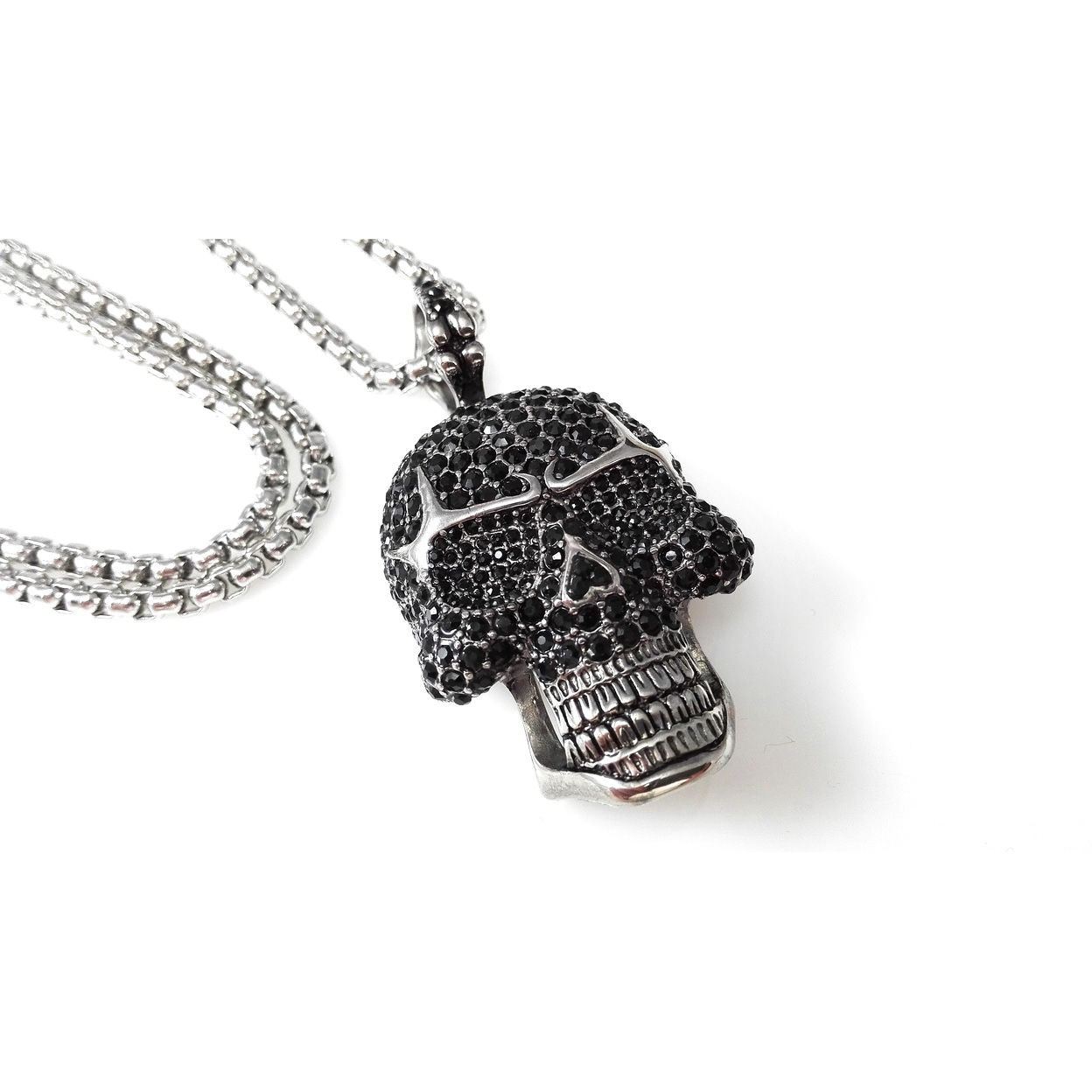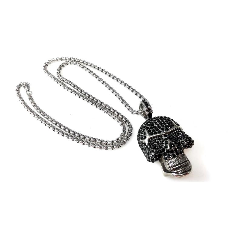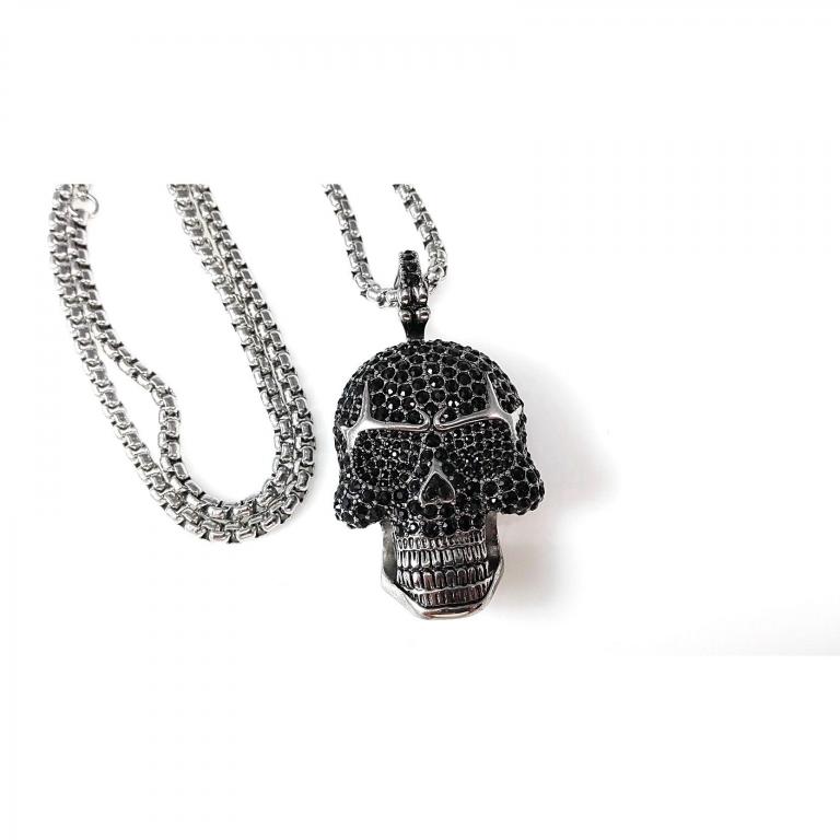 Edelstahlkette mit großem Skull Anhänger , mit über 100 schwarzen Zirkonia Steinen, Anhänger Grösse 62 mm x 35 mm, runde Venezianer Edelstahlkette 70cm Länge , 4 mm Stärke , mit Karabiner Verschluss
