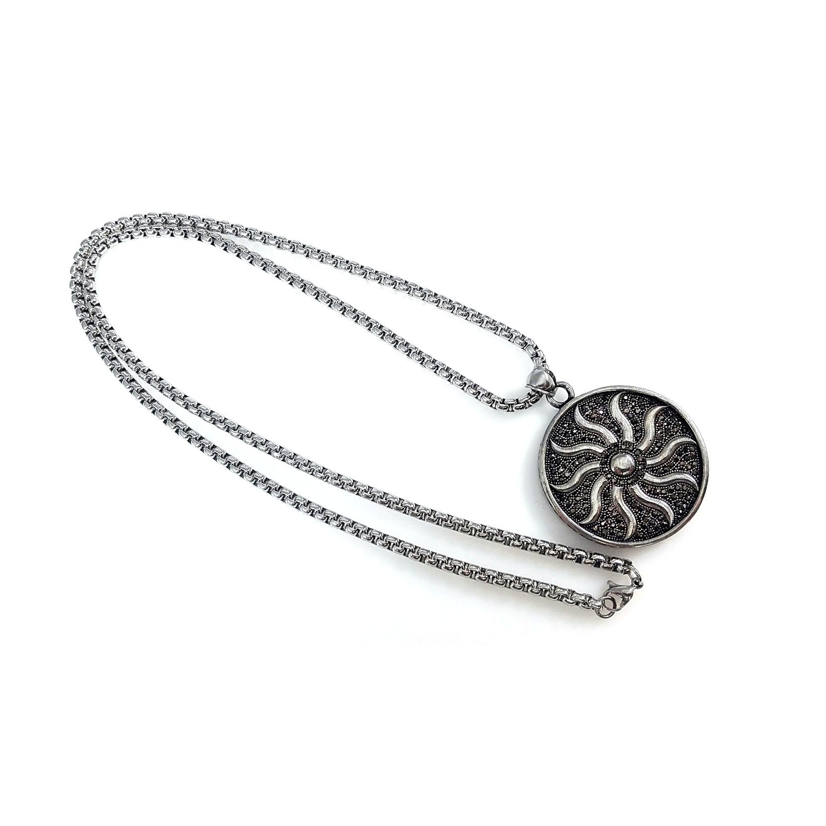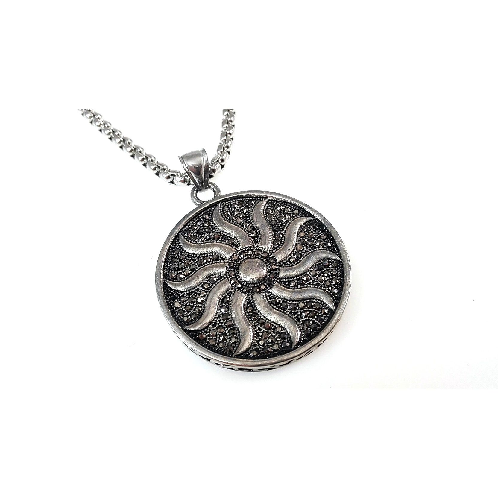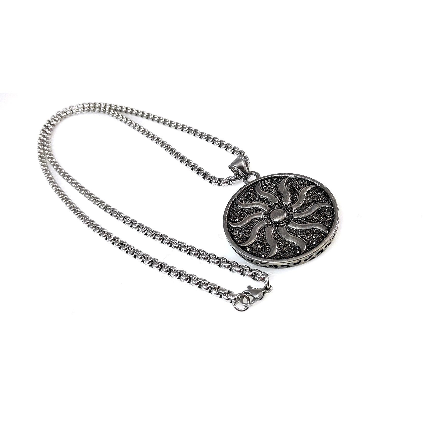 Edelstahlkette mit grossem runden Anhänger, mit Sonnen mandala Design und Markasit Steinen schwarz, Anhänger Grösse 55 mm x 42 mm, Venezianer Edelstahlkette 70cm Länge 4 mm Stärke, gute Qualität , massive Ausführung