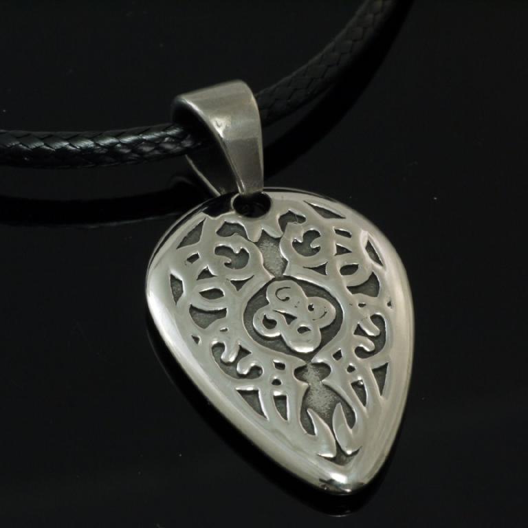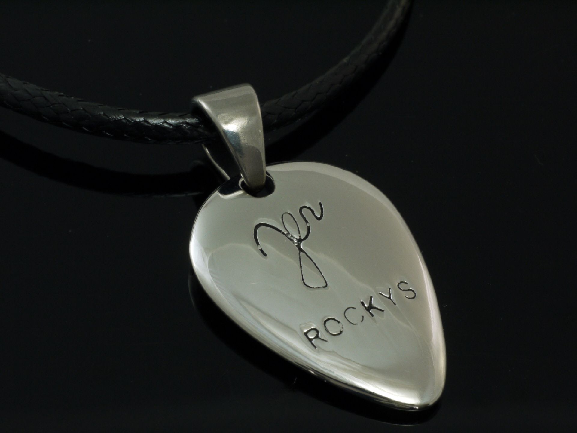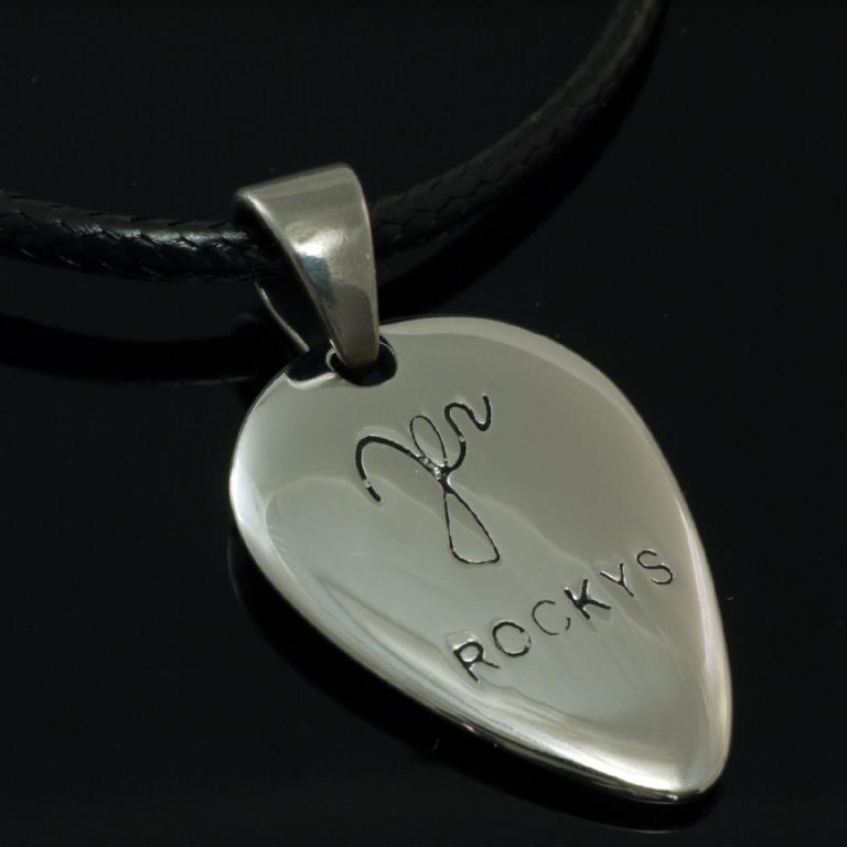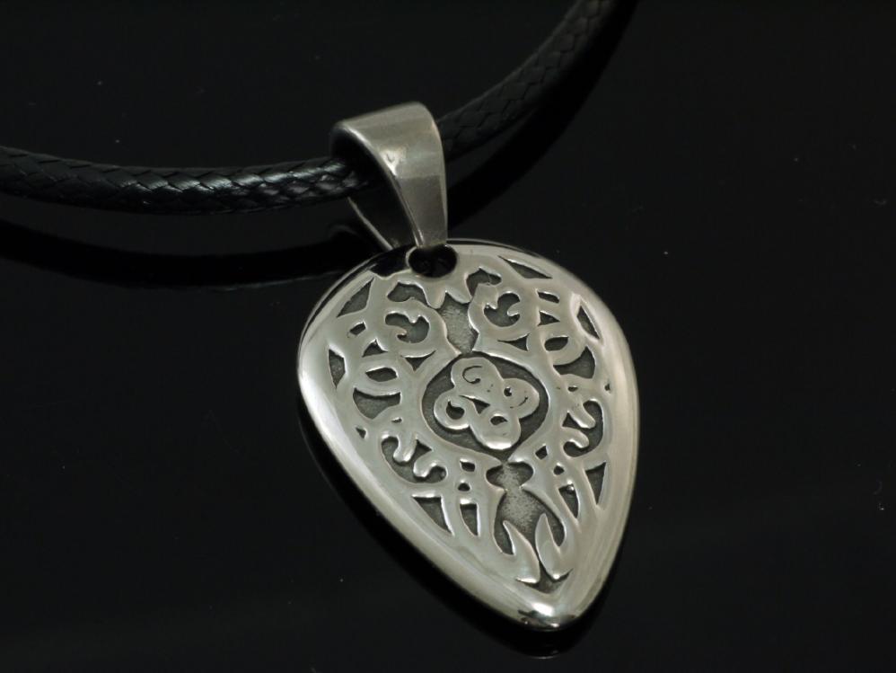 Jen Majura Plektrum Edelstahl Anhänger Grösse 30mm Länge 17 mm Breite mit 50cm langer Baumwollkette - auf Rückseite mit Signatur von Jen - Edelstahl Anhänger in Antik Optik