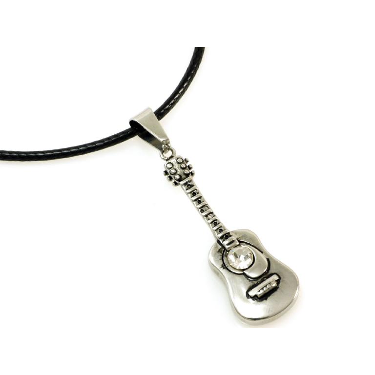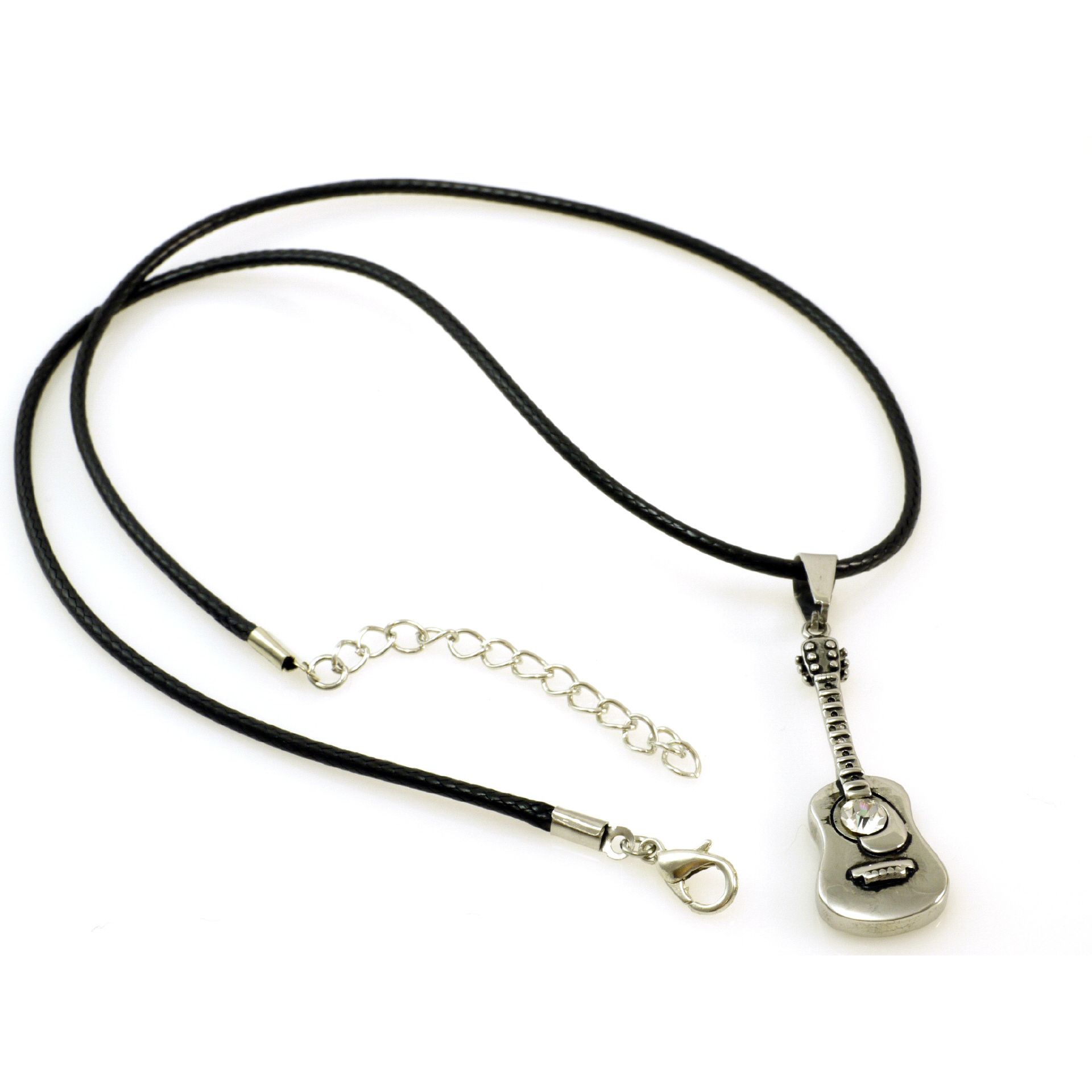 Western Gitarre aus Edelstahl mit gewachster Stoffkette Größe 50mm x 14 mm, mit Zirkonia Stein Stoffband 2mm Stärke, 50cm Länge mit Karabiner Verschluss mit Verlängerungskette
