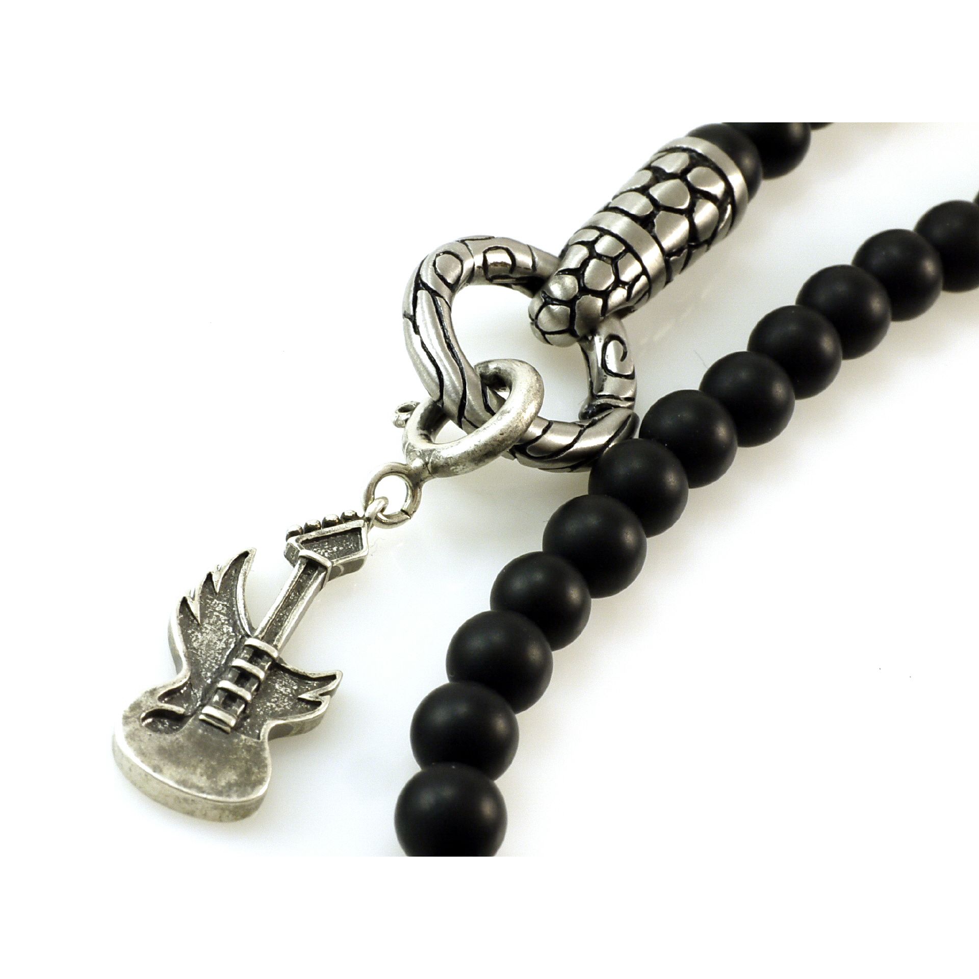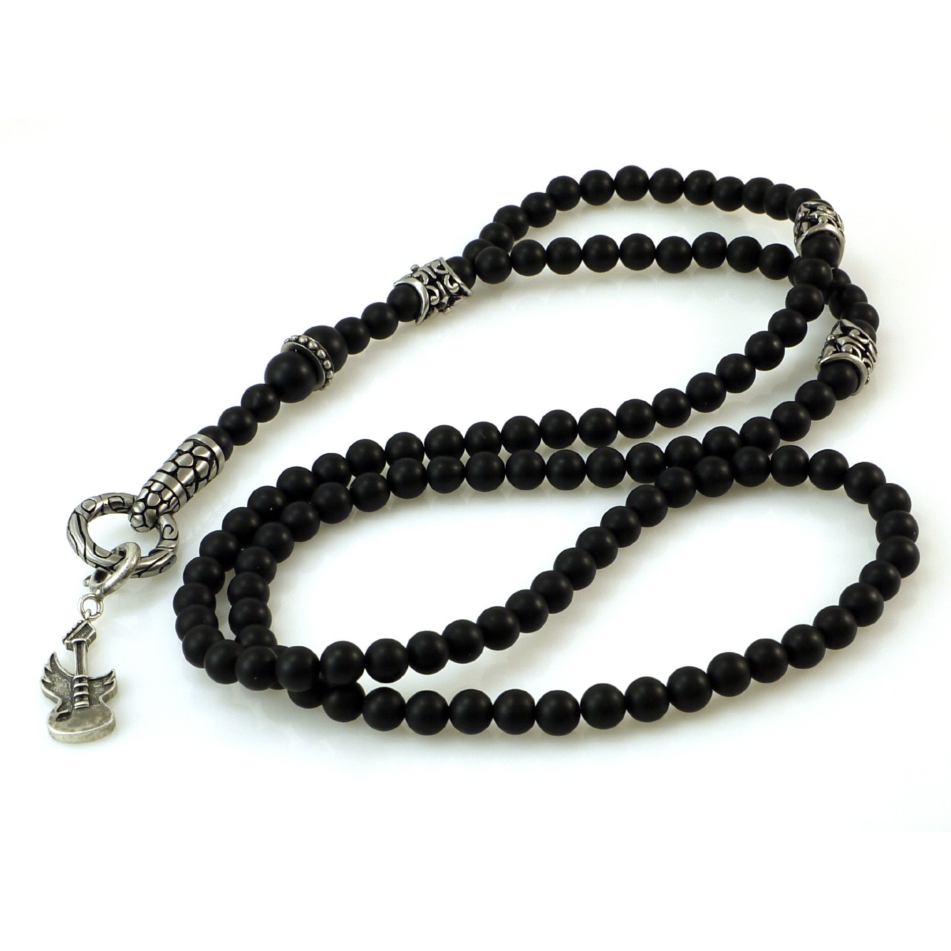 Jen Majura Design Achat Kugelkette mit Gitarren Silber Anhänger , mit matten Achatkugeln, mit 4 Edelstahl Design Elementen und einem großen Ring der sich nach Innen öffnen läßt, Silber Anhänger Grösse 40mm Länge 10 mm Breite, alle Edelstahl Elemente mattiert, Länge der Kette 65 cm, plus Verlängerung 80 mm Länge