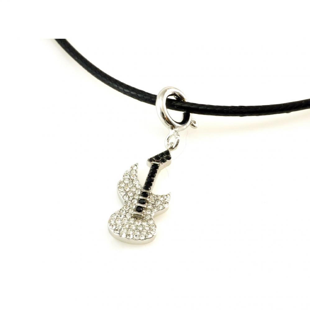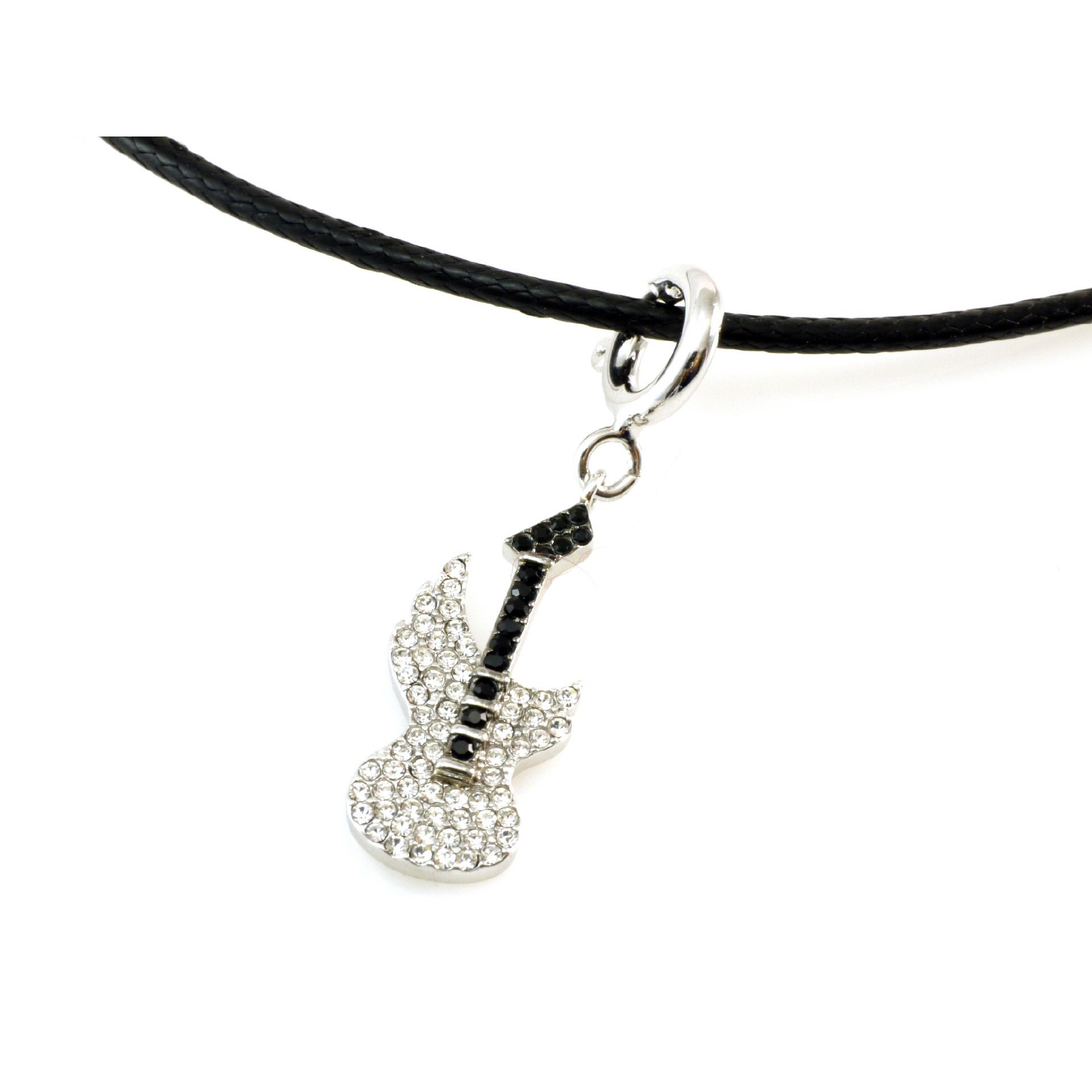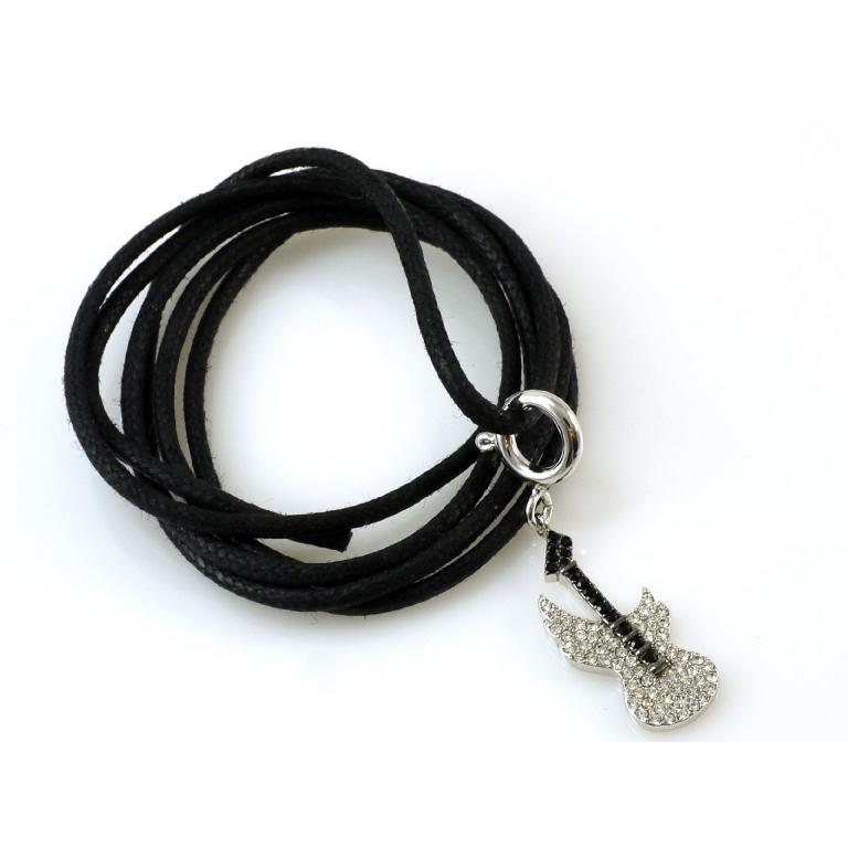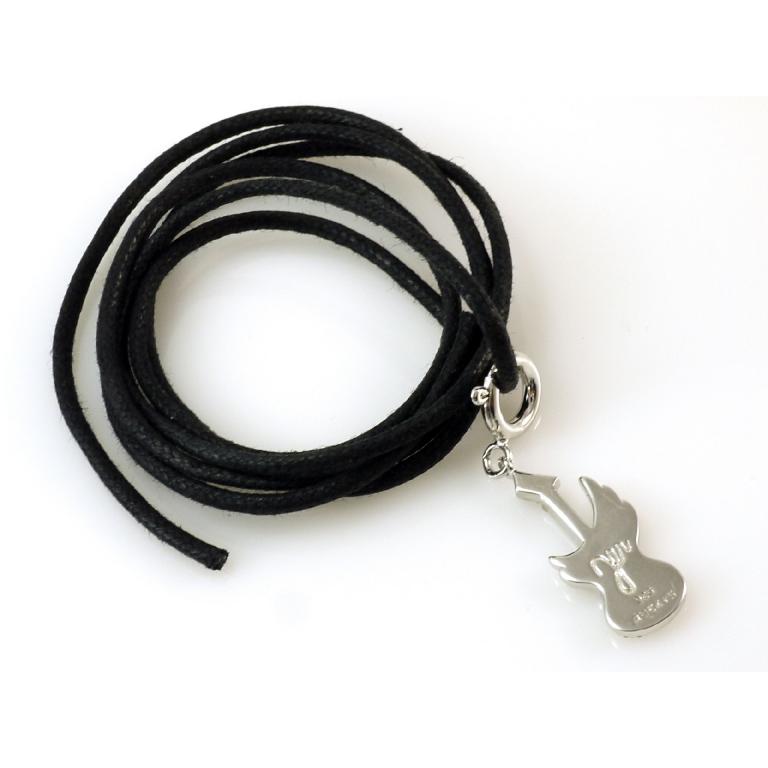 Jen Majura Silber Gitarren Anhänger - mit weissen und schwarzen Zirkonia Steinen - Grösse 40mm Länge 10 mm Breite - mit 80cm langem gewachstem Stoffband - auf Rückseite mit Signatur von Jen