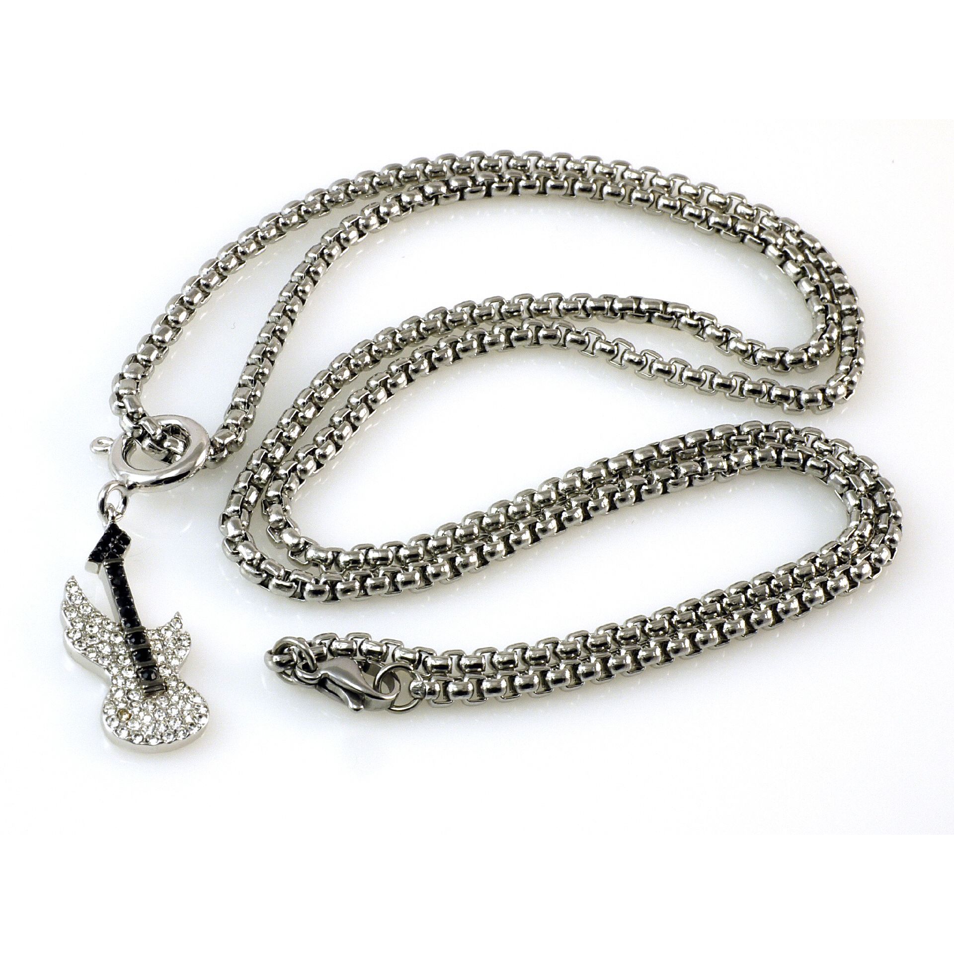 Jen Majura Gitarren Silber Anhänger mit weissen und schwarzen Zirkonia Steinen , mit Signatur Jen auf der Rückseite , Silber Anhänger Grösse 40mm Länge 10 mm Breite, mit Edelstahlkette 3mm Stärke und 50 cm Länge