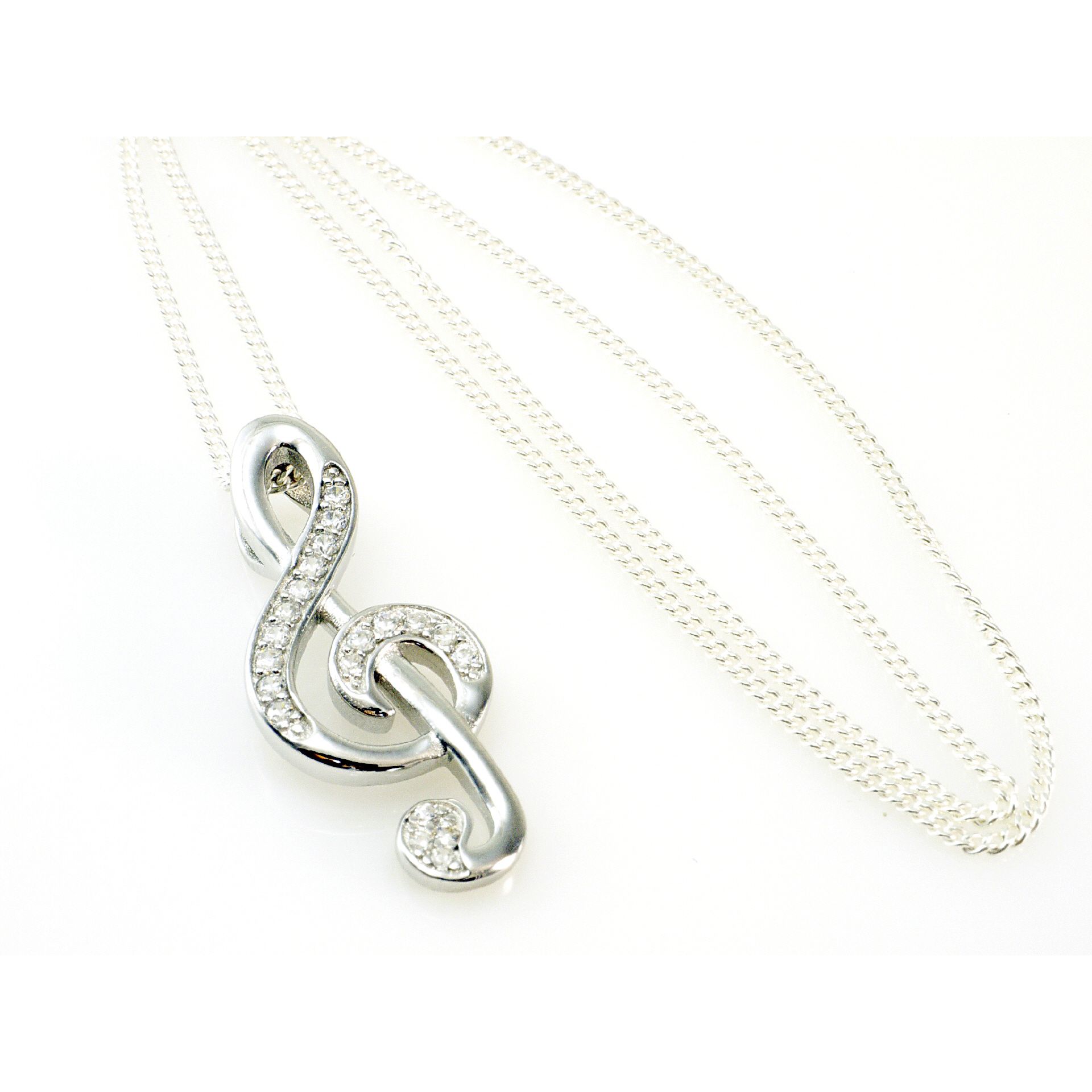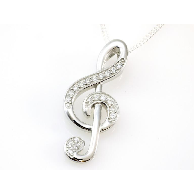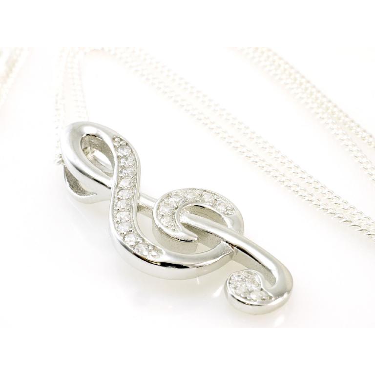 925 Silber Notenschlüssel mit Silberkette in 45 cm Länge, mit gefaßten Zirkonia Steinen, Anhänger Größe 30mm x 12,5 mm, mit Geschenkbox