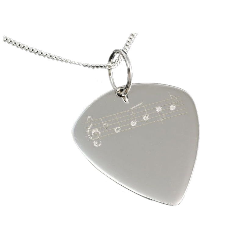 Plektrum mit Notenzeile gelasert Design beidseitig gelasert Material: 925er Silber Größe: ca. 33 x 26 mm Stärke des Plektrums ca. 1,3 mm mit 1,4 mm starker Silber-Panzerkette mit 45 cm Länge