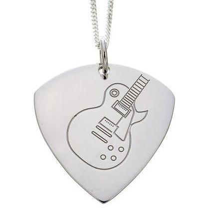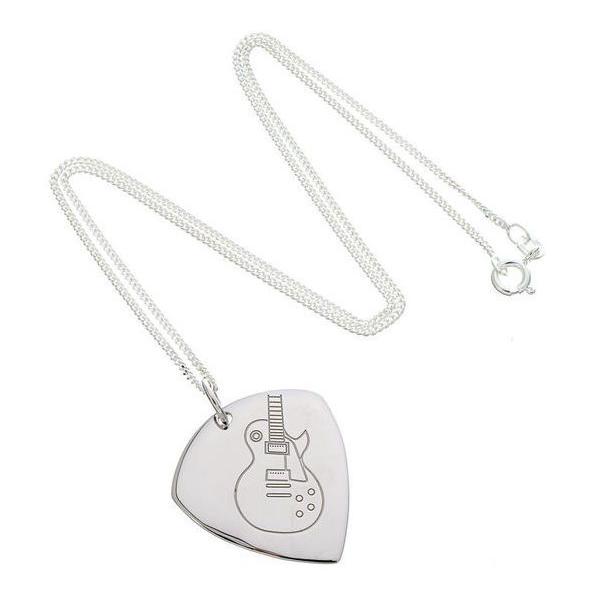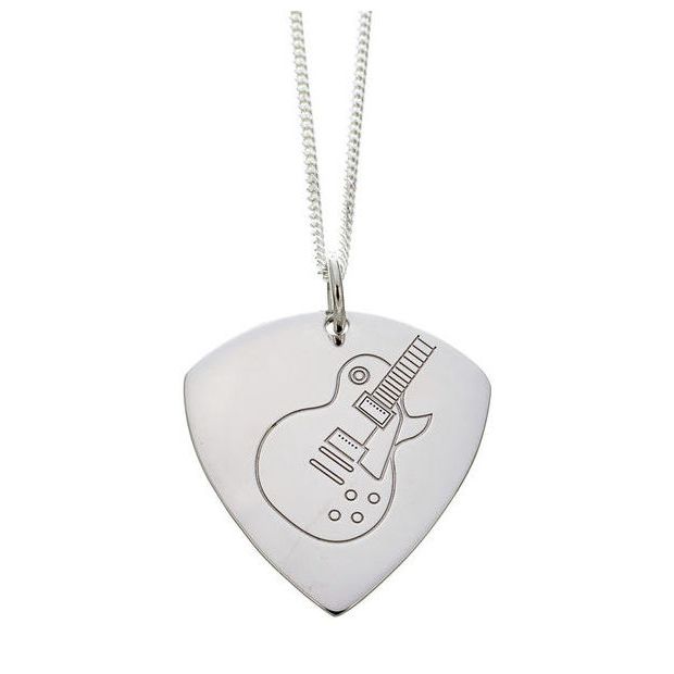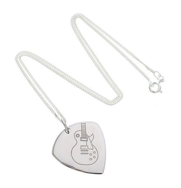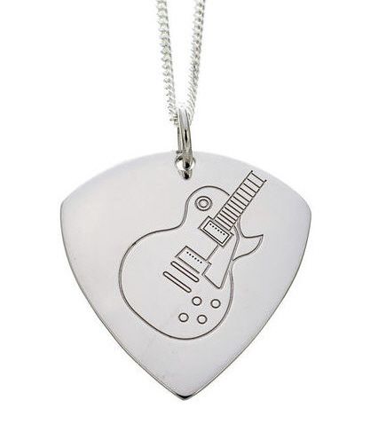 Plektrum-Anhänger mit Kette aus 925 Silber Design: LP-Style-Gitarre Anhänger beidseitig geprägt 925 Silber Größe: ca. 33 mm x 26 mm 1,4 mm starke Silber-Panzerkette mit 45 cm Länge Stärke des Plektrums: 1,3 mm