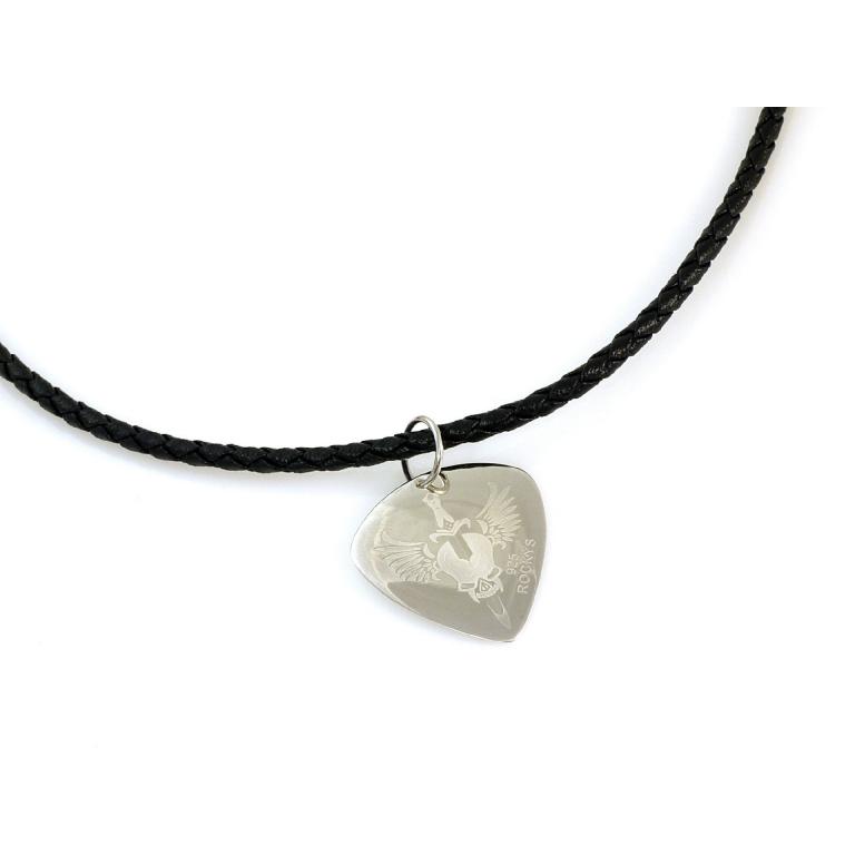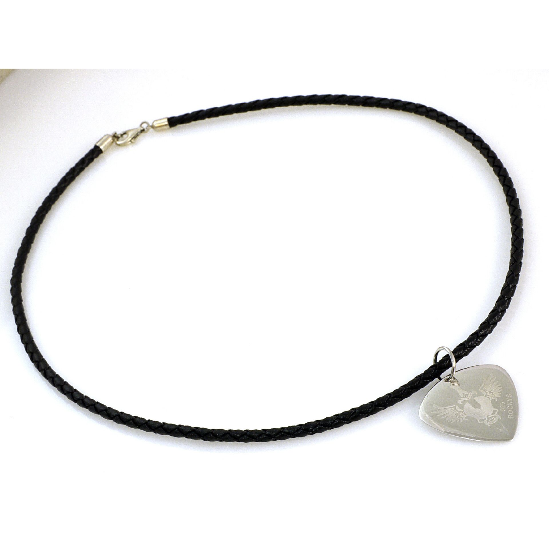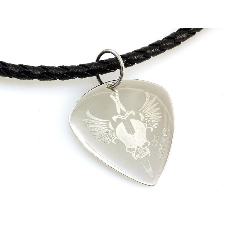 ROCKYS Silber Plektrum mit Lederkette und Silberschließe Design Skull gelasert, mit 50cm Lederkette 3mm Stärke Plektrum Größe: 29mm x 26mm, Design von beiden Seiten Material: 925 Sterling Silber und Leder
