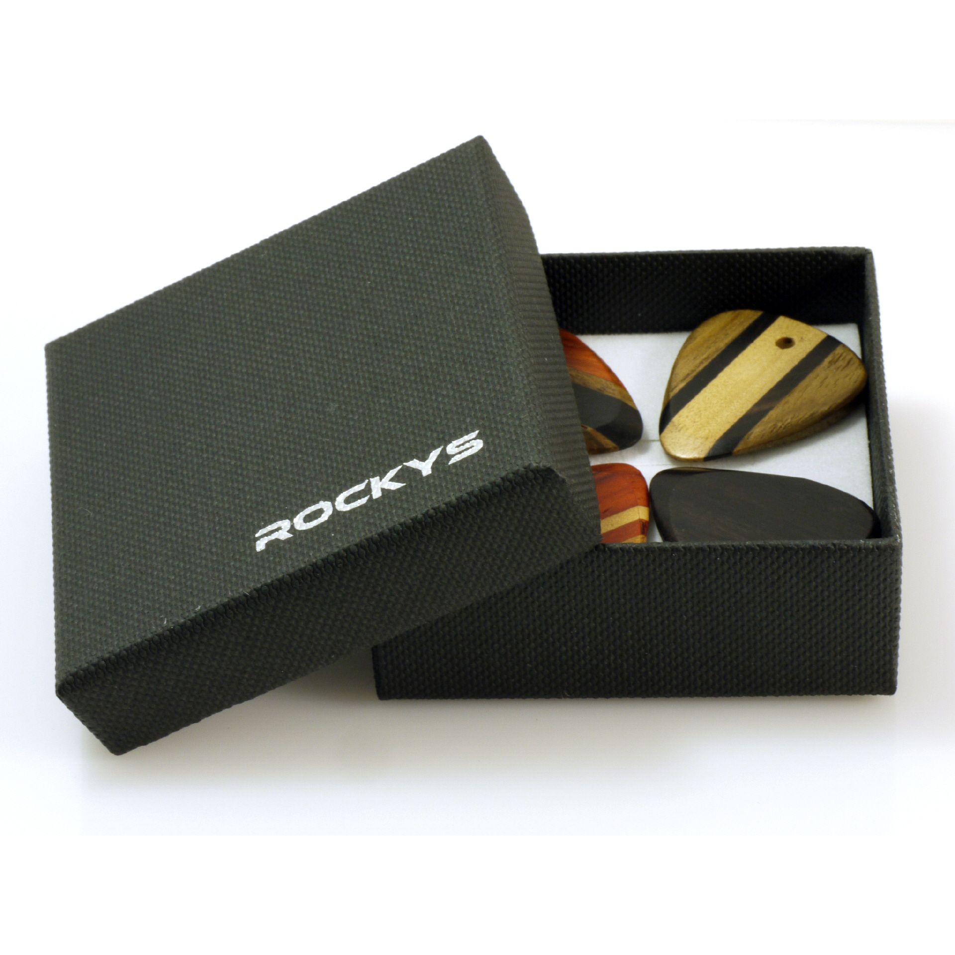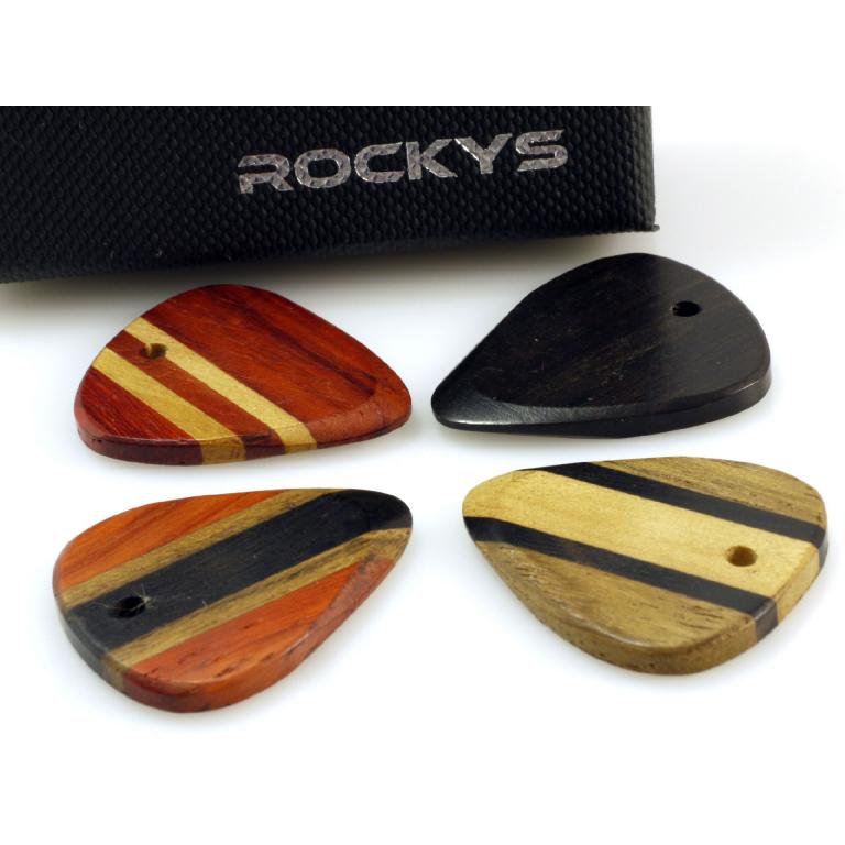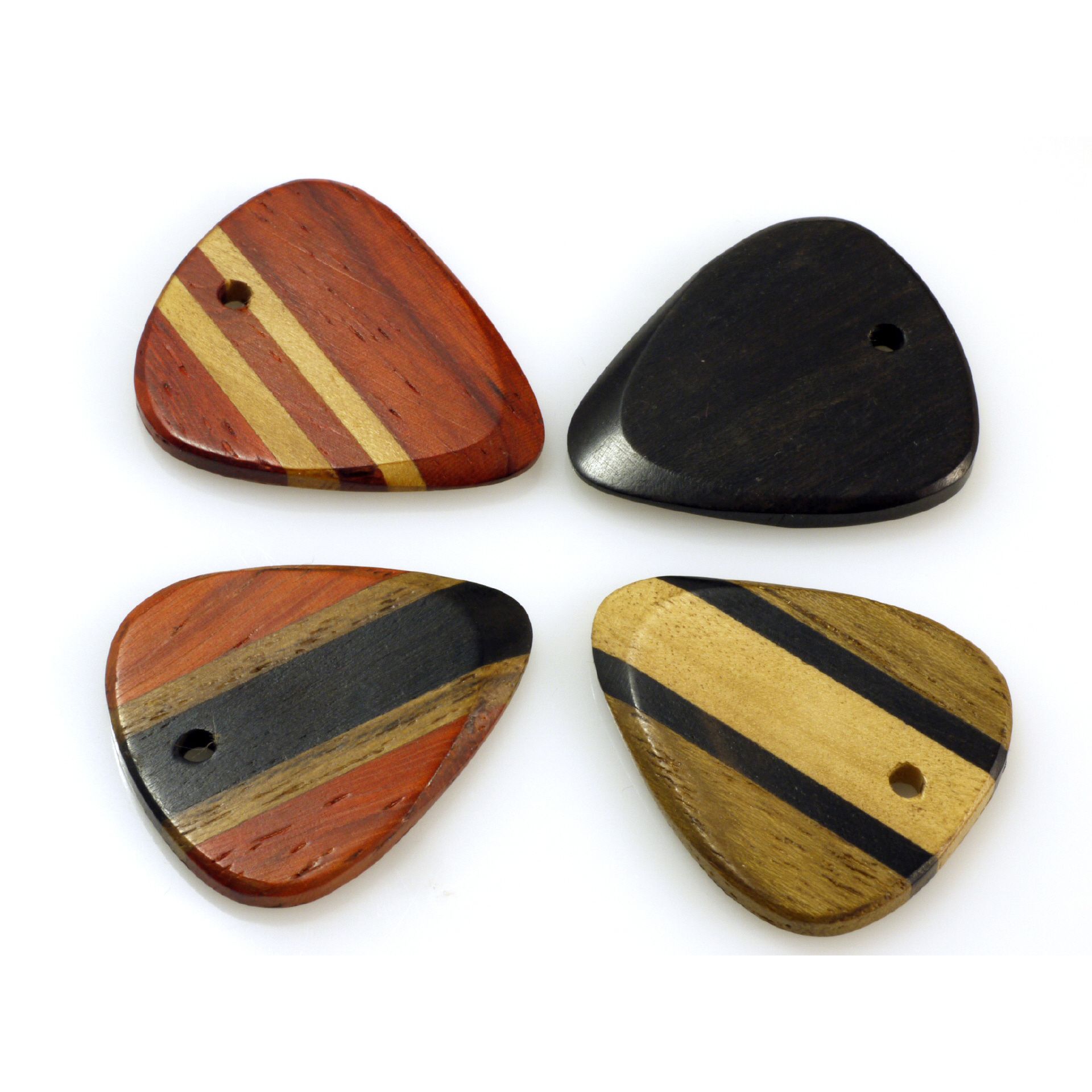 Holz Pletrum Set 4 Stück in Geschenkbox, Standard Grösse 30mm x 25 mm, aus Ebony - Hickory - Palm Holz gut verarbeitet, mit Loch für Anhänger