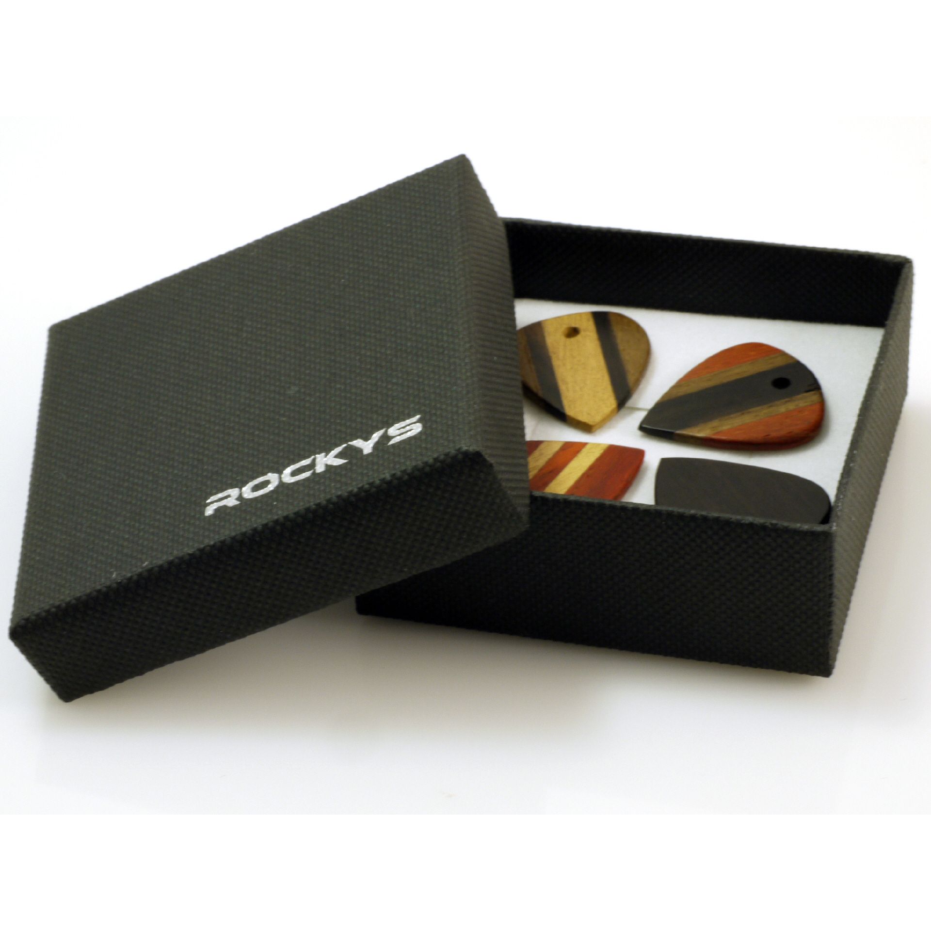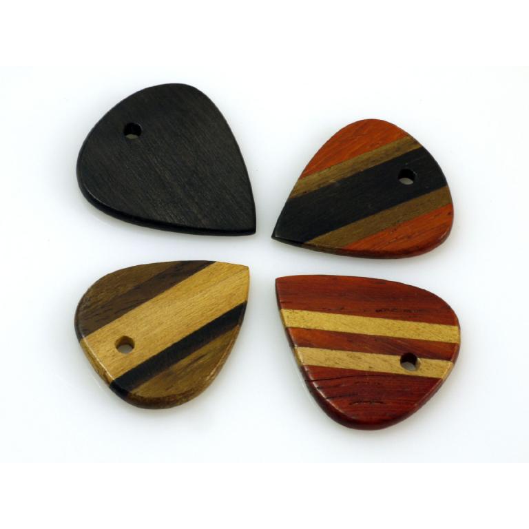Holz Pletrum Set 4 Stück in Geschenkbox, Jazz Grösse 25mm x 22 mm, aus Ebony - Hickory - Palm Holz gut verarbeitet, mit Loch für Anhänger