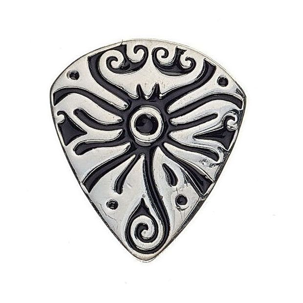 Metall-Plektrum klassische 351-Form Material: Messing gegossen, handpoliert und versilbert mit 925 Sterling Silber Farbe im Motiv: Epoxylack, schwarz Größe: ca. 30 x 26,5 mm Stärke: ca. 2,4 - 2,7 mm Gewicht: ca. 9 Gramm