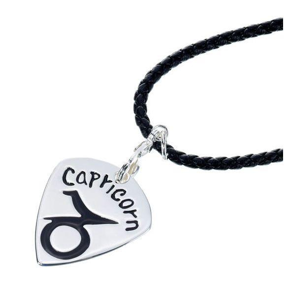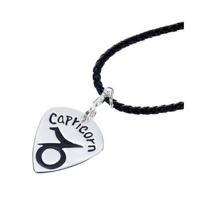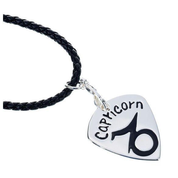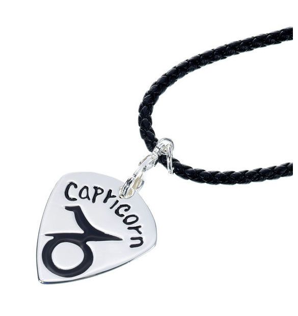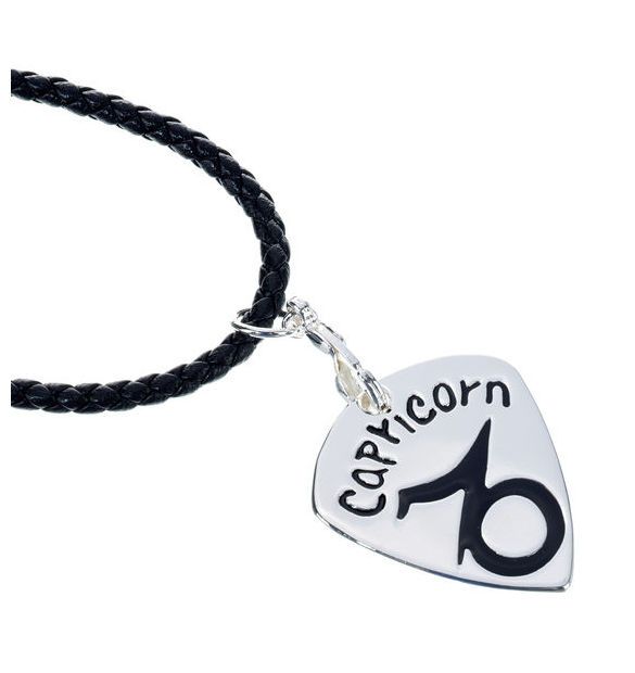 Metall Plektrum mit Halskette mit schwarzer Kette in Leder Optik das Plektrum einfach aus dem Karabiner Haken herausnehmen, spielen und danach wieder einhängen, so geht das Plektrum nie wieder verloren schöne Optik mit Sternzeichen Steinbock geflochtene Kette in schwarzer Leder Optik 50 cm Länge extra großer Karabiner Haken klassisches 351 Form Plektrum Material: Messing, gegossen, handpoliert und versilbert mit 925 Sterling Silber Größe: ca. 30 x 26,5 mm Stärke: ca. 2,4 - 2,7 mm Gewicht: ca. 9 g Farbe im Motiv: Epoxylack, schwarz Steinbock 22.12. - 20.01.