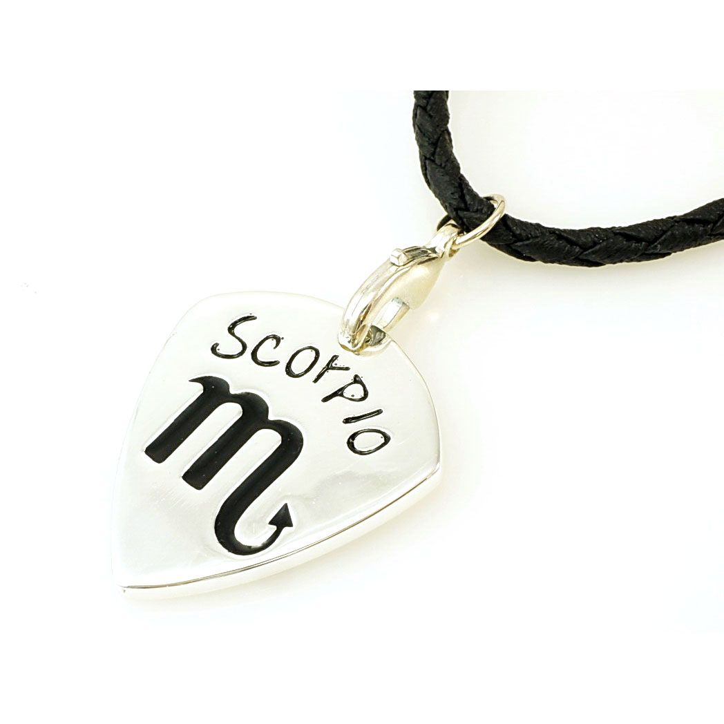 Metall Plektrum mit Halskette mit schwarzer Kette in Leder Optik das Plektrum einfach aus dem Karabiner Haken herausnehmen, spielen und danach wieder einhängen, so geht das Plektrum nie wieder verloren schöne Optik mit Sternzeichen Skorpion , geflochtene Kette in schwarzer Leder Optik 50 cm Länge extra großer Karabiner Haken klassisches 351 Form Plektrum Material: Messing, gegossen, handpoliert und versilbert mit 925 Sterling Silber Größe: ca. 30 x 26,5 mm Stärke: ca. 2,4 - 2,7 mm Gewicht: ca. 9 g Farbe im Motiv: Epoxylack, schwarz