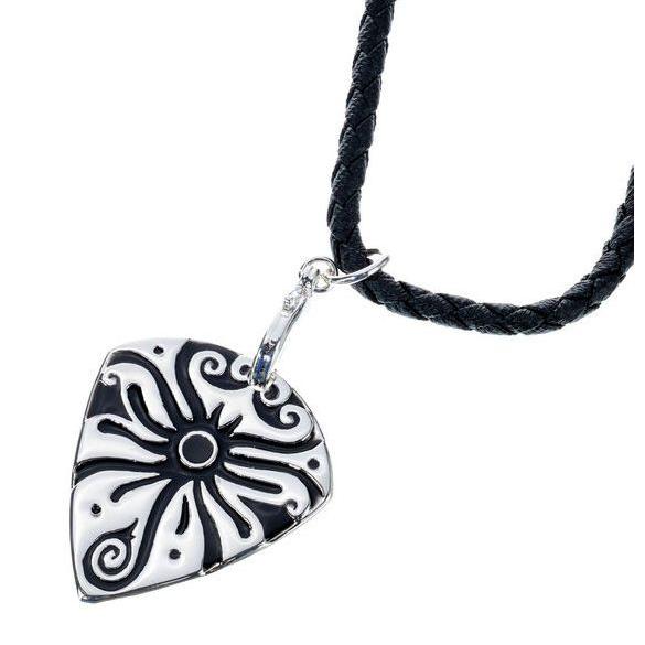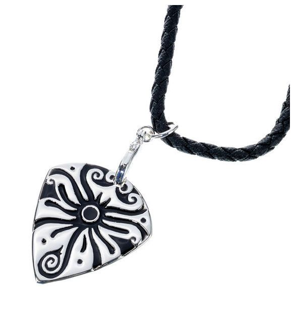 Metall Plektrum mit Halskette Modell Black Hole Sun mit schwarzer Kette in Leder Optik das Plektrum einfach aus dem Karabiner Haken herausnehmen, spielen und danach wieder einhängen, so geht das Plektrum nie wieder verloren geflochtene Kette in schwarzer Leder Optik 50 cm Länge extra großer Karabiner Haken klassisches 351 Form Plektrum Material: Messing, gegossen, handpoliert und versilbert mit 925 Sterling Silber Größe: ca. 30 x 26,5 mm Stärke: ca. 2,4 - 2,7 mm Gewicht: ca. 9 g Farbe im Motiv: Epoxylack, schwarz