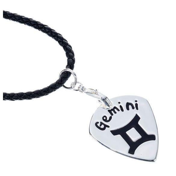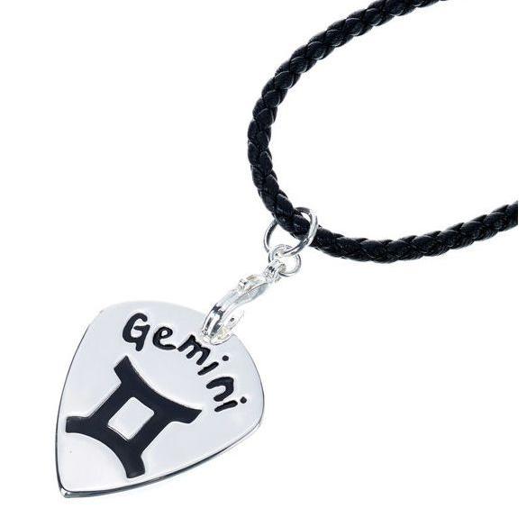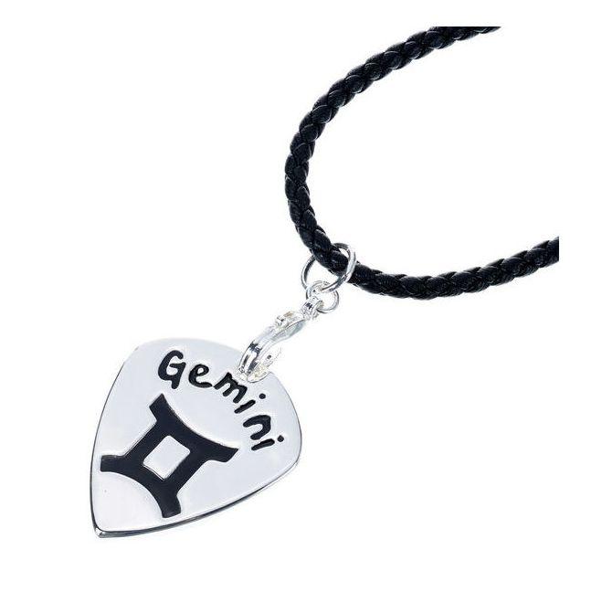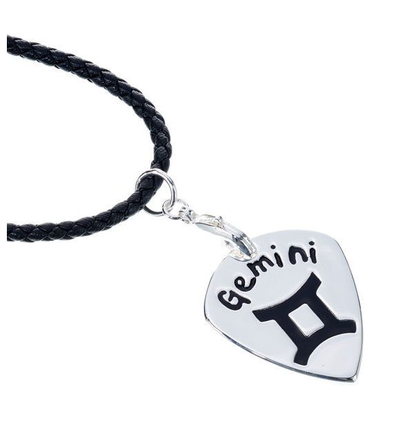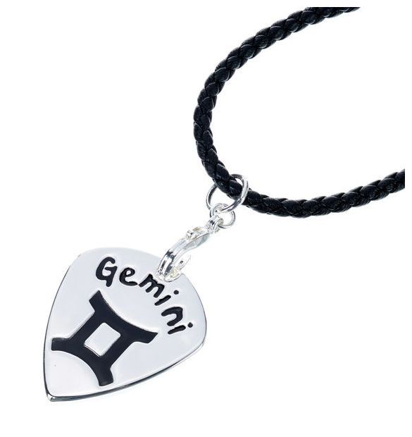 Metall Plektrum mit Halskette mit schwarzer Kette in Leder Optik das Plektrum einfach aus dem Karabiner Haken herausnehmen, spielen und danach wieder einhängen, so geht das Plektrum nie wieder verloren schöne Optik mit Sternzeichen Zwillinge , geflochtene Kette in schwarzer Leder Optik 50 cm Länge extra großer Karabiner Haken klassisches 351 Form Plektrum Material: Messing, gegossen, handpoliert und versilbert mit 925 Sterling Silber Größe: ca. 30 x 26,5 mm Stärke: ca. 2,4 - 2,7 mm Gewicht: ca. 9 g Farbe im Motiv: Epoxylack, schwarz Zwillinge 21.05. - 21.06.