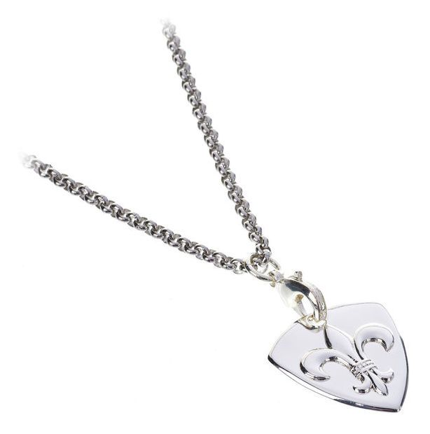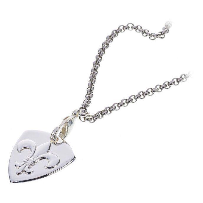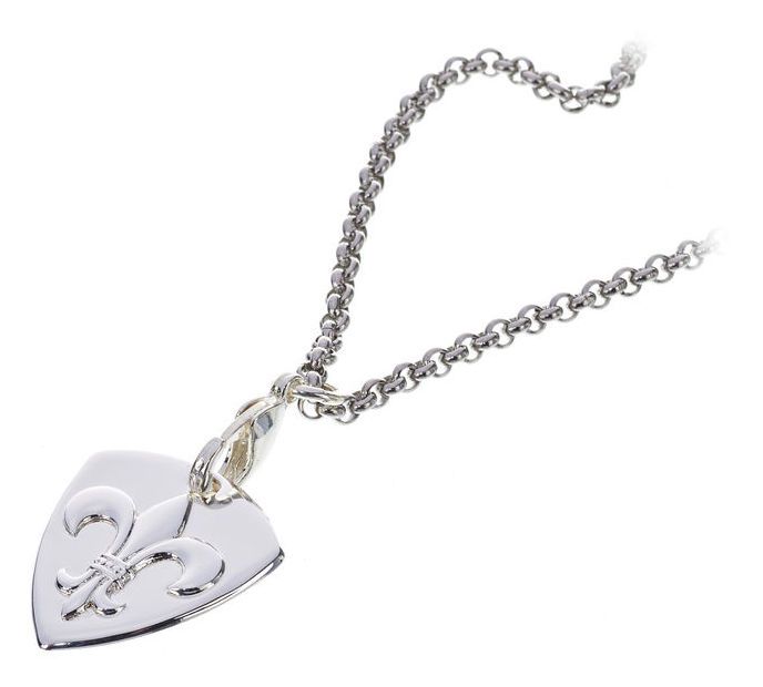 Metall Plektrum Kette Plektrum Lilie mit Edelstahlkette in 50 cm Länge Das Plektrum einfach aus dem Karabiner Haken herausnehmen, spielen und danach wieder einhängen, so geht das Plektrum nie wieder verloren Mit extra großem Karabiner Haken PL 9675 klassische Jazz Plektrum Form (kleine 351 Form) Material: Messing gegossen handpoliert und versilbert mit 925 Sterling Silber Motiv: Lilie erhabenes Motiv, sehr schön herausgearbeitet Größe ca. 25 x 22,5 mm Stärke ca. 1,8 - 2,3 mm Gewicht ca. 5 Gramm