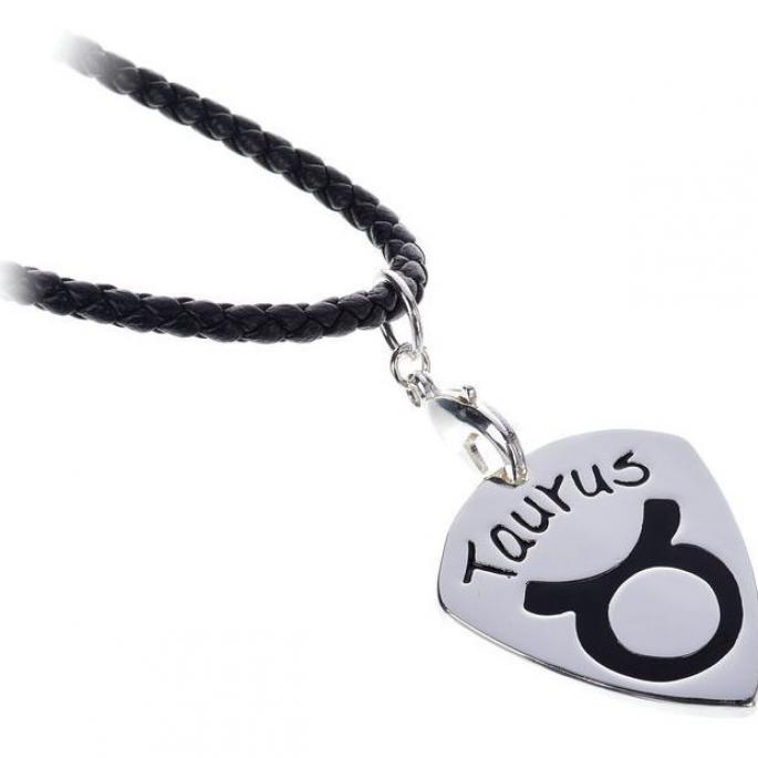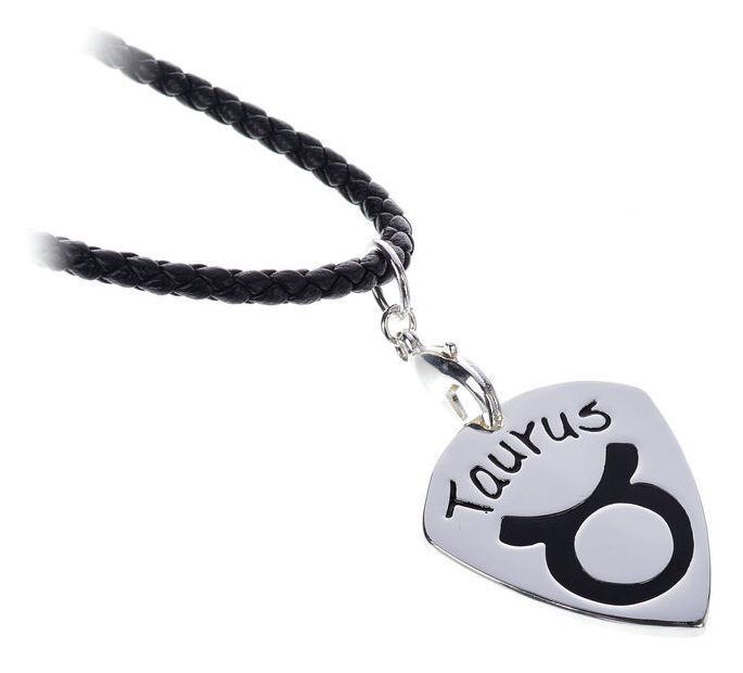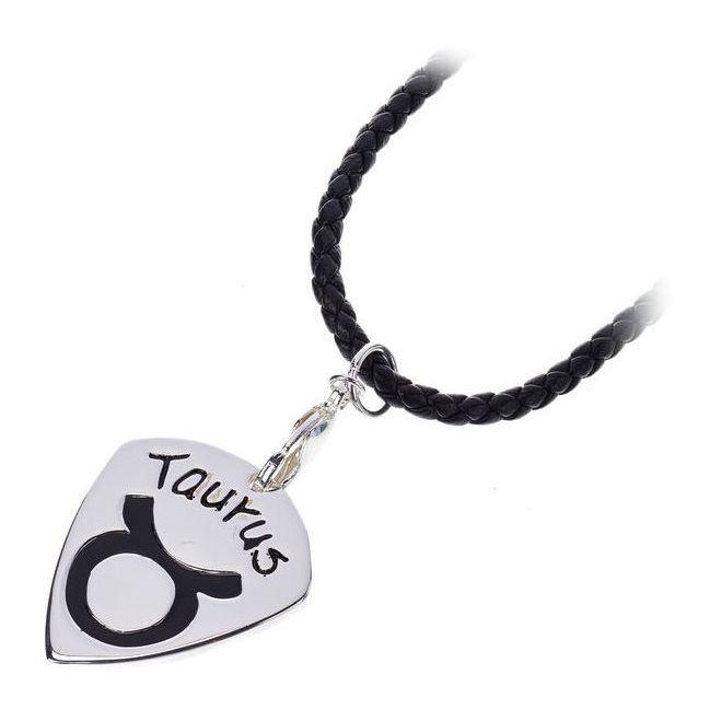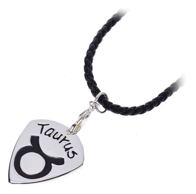 Metall Plektrum mit Halskette mit schwarzer Kette in Leder Optik das Plektrum einfach aus dem Karabiner Haken herausnehmen, spielen und danach wieder einhängen, so geht das Plektrum nie wieder verloren schöne Optik mit Sternzeichen Stier , geflochtene Kette in schwarzer Leder Optik 50 cm Länge extra großer Karabiner Haken klassisches 351 Form Plektrum Material: Messing, gegossen, handpoliert und versilbert mit 925 Sterling Silber Größe: ca. 30 x 26,5 mm Stärke: ca. 2,4 - 2,7 mm Gewicht: ca. 9 g Farbe im Motiv: Epoxylack, schwarz Stier 21.04. - 20.05.