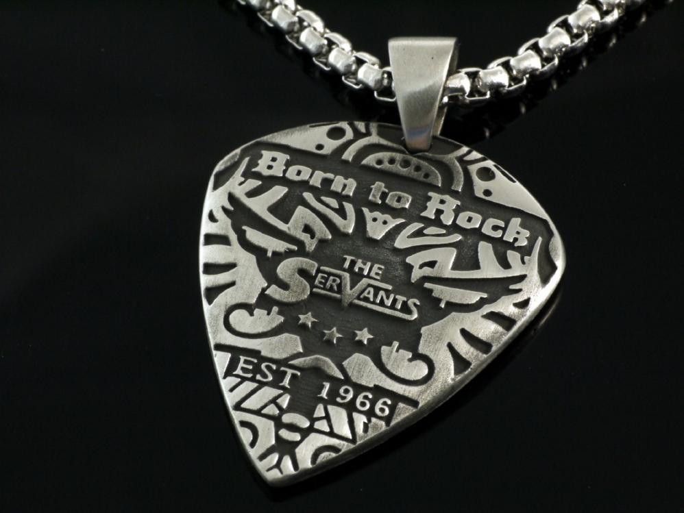 Plektrum Kette The Servants im vintage look mit Edelstahlkette, Anhänger Grösse 35 mm mit Schlaufe 27mm Breite, silber - grau rhodiniert - Design von beiden Seiten - mit Edelstahlkette 3mm Stärke und 50 cm Länge