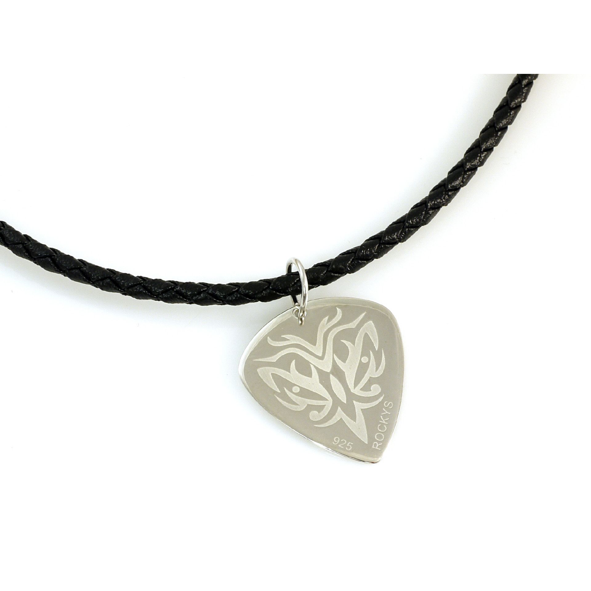 ROCKYS Silber Plektrum mit Lederkette und Silberschließe Design Black Hole Sun gelasert, mit 50cm Lederkette 3mm Stärke Plektrum Größe: 29mm x 26mm, Design von beiden Seiten Material: 925 Sterling Silber und Leder