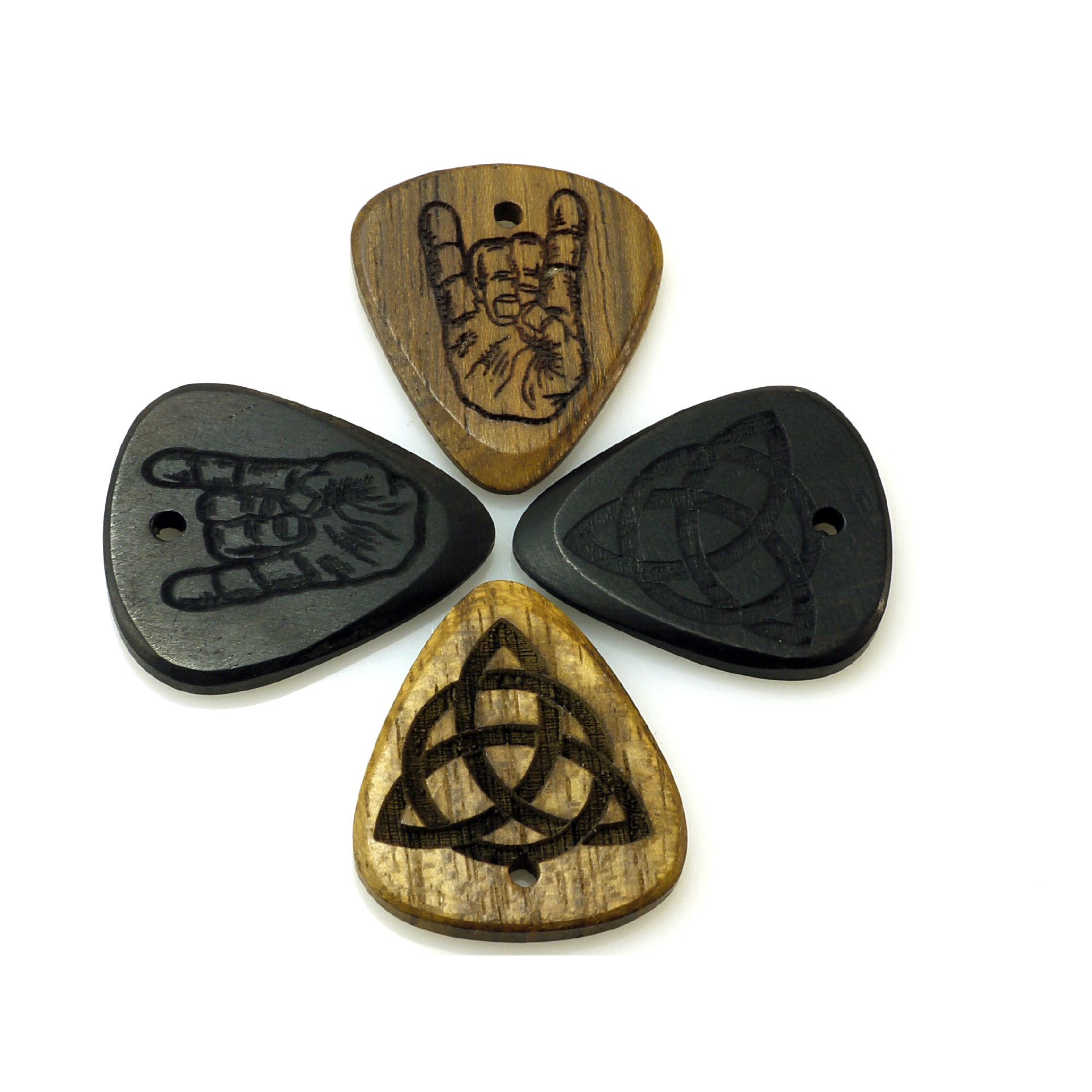 Holz Pletrum Set mit Laser Design für besseren Grip 4 Stück in Geschenkbox Standard Grösse 30mm x 25 mm, aus Ebony und Mimosa Holz mit Loch für Anhänger mit Geschenkbox