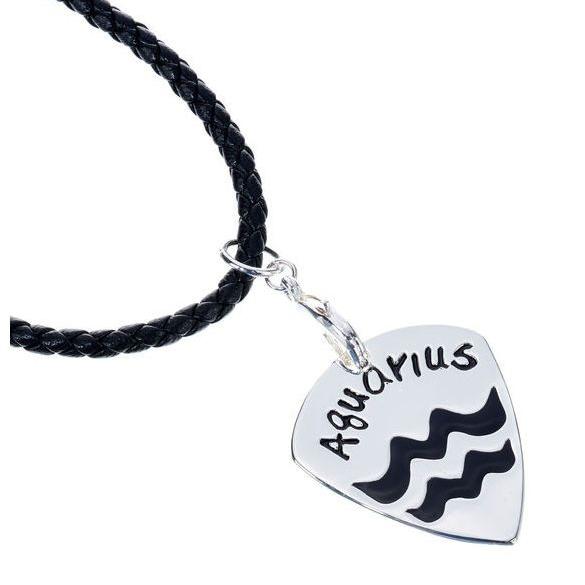 Metall Plektrum mit Halskette mit schwarzer Kette in Leder Optik das Plektrum einfach aus dem Karabiner Haken herausnehmen, spielen und danach wieder einhängen, so geht das Plektrum nie wieder verloren schöne Optik mit Sternzeichen Wassermann , geflochtene Kette in schwarzer Leder Optik 50 cm Länge extra großer Karabiner Haken klassisches 351 Form Plektrum Material: Messing, gegossen, handpoliert und versilbert mit 925 Sterling Silber Größe: ca. 30 x 26,5 mm Stärke: ca. 2,4 - 2,7 mm Gewicht: ca. 9 g Farbe im Motiv: Epoxylack, schwarz Waage 24.09. - 23.10.